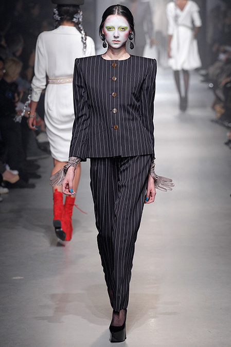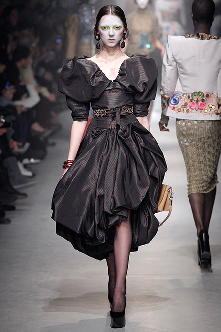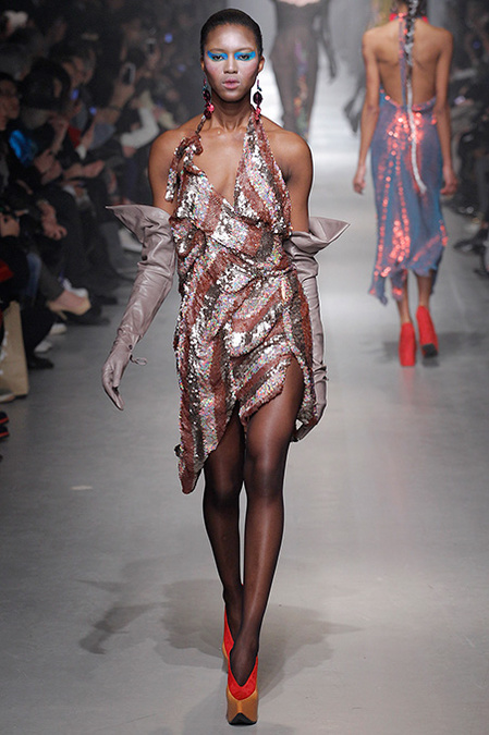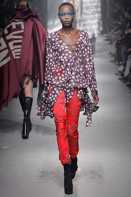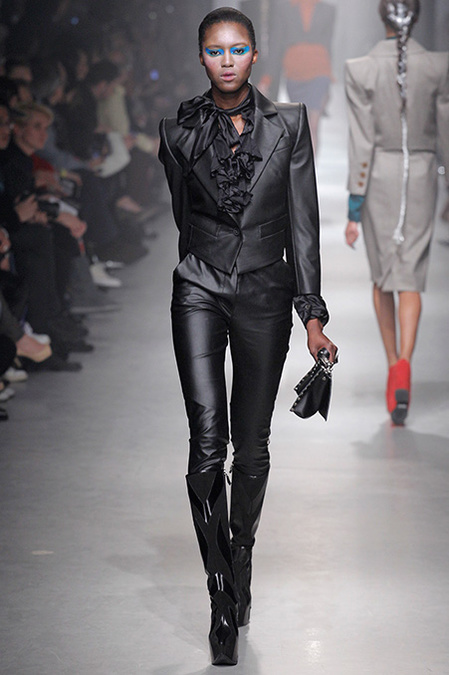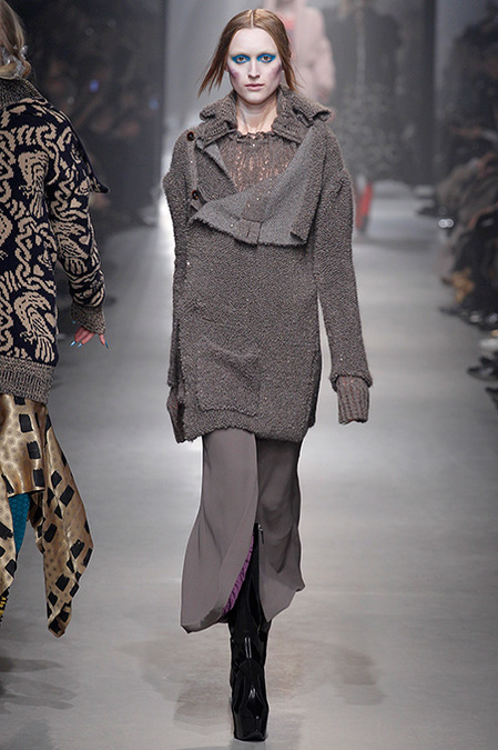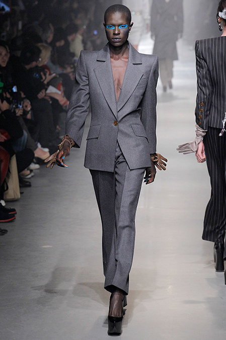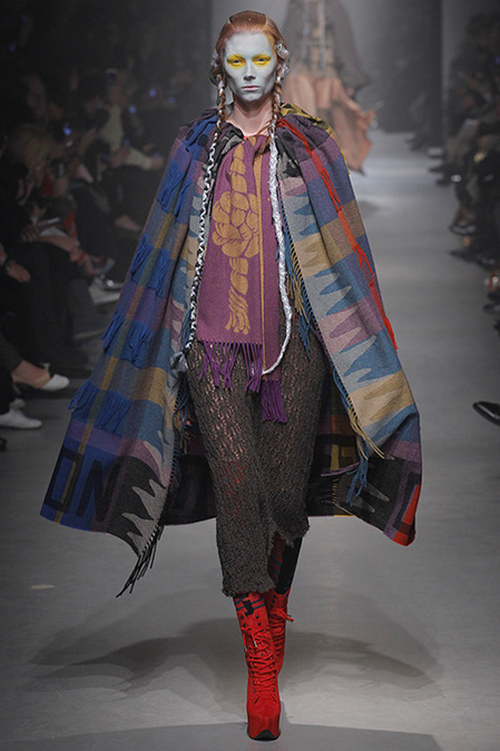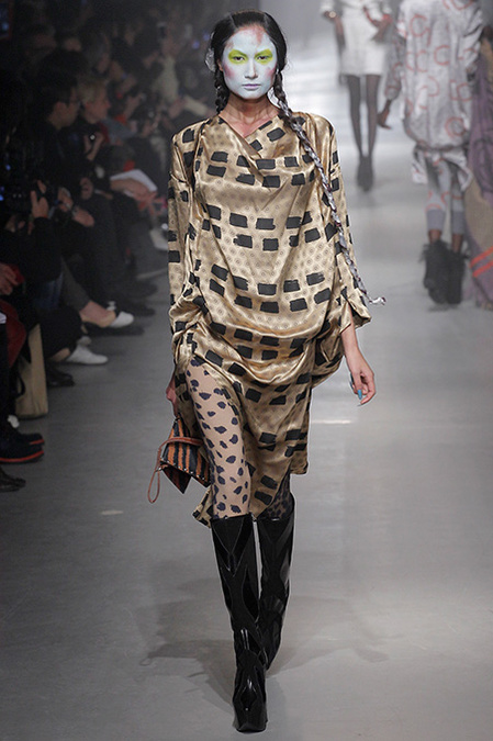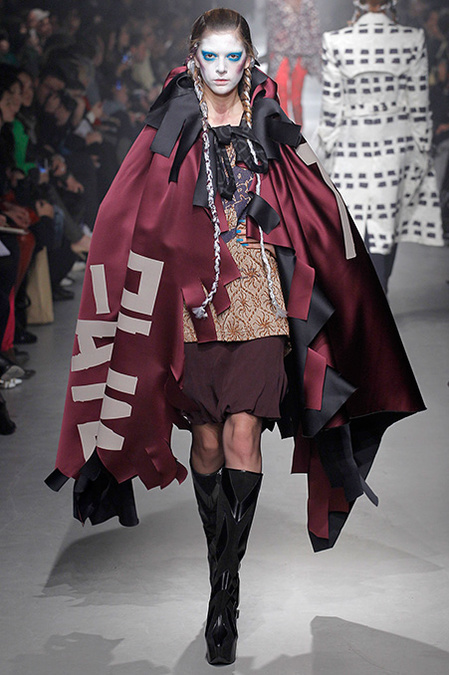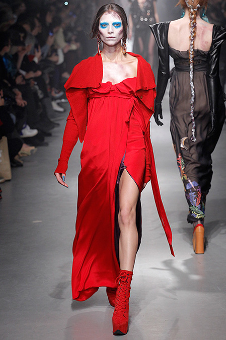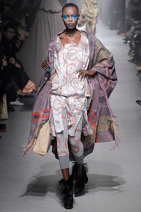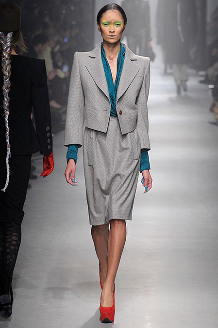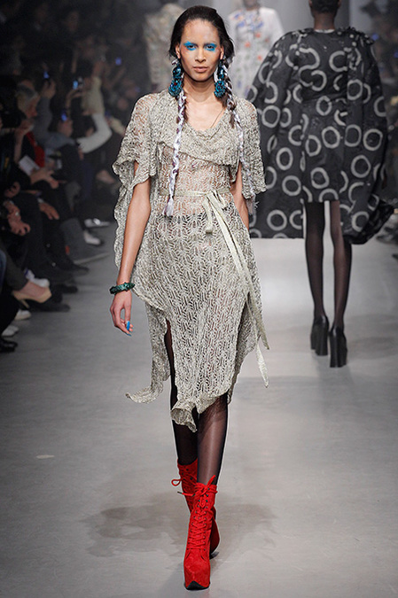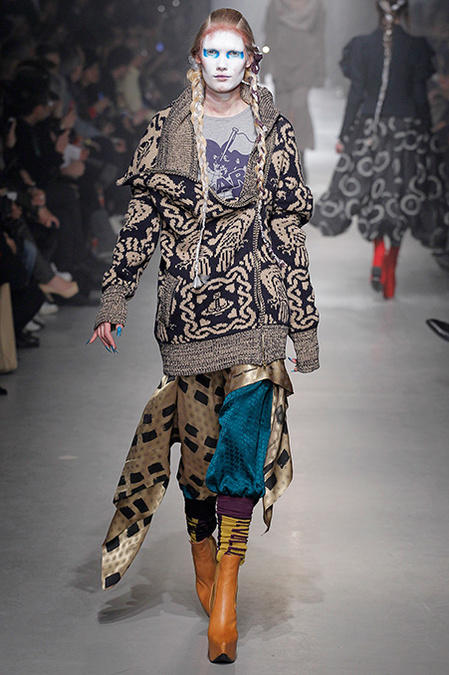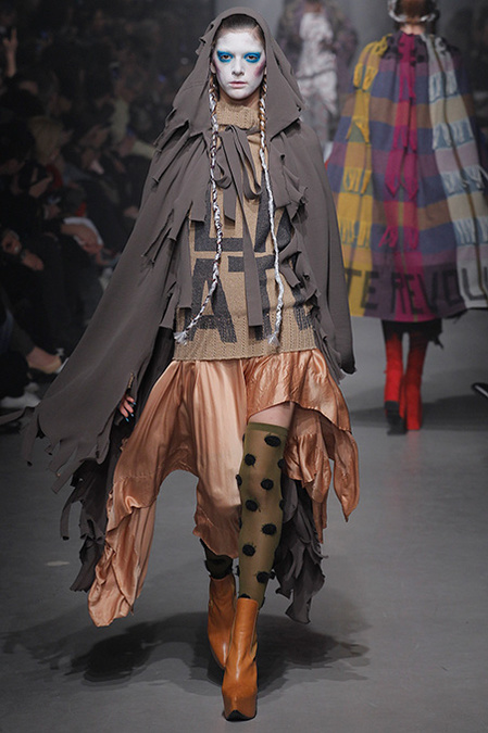 A Westwood collection typically runs a gamut from hyper-sophisticated tailoring to glamorous languor to pagan disarray. Today was no exception. A rigorous, broad-shouldered gray flannel pantsuit shared catwalk space with a fishtail goddess gown wrapped in brocade, and a tattered, hooded cape over a message knit and a flyaway silk-scarf skirt. What every look shared was dramatically heightened makeup that suggested barbarian queens here, battered wives there. That such ambiguity could even exist is one of those perplexing Westwood conundrums. The activist message she is happiest conveying was clear enough in the paperwork on our seats. Exactly what she would like us to get from her clothes was much less distinct.