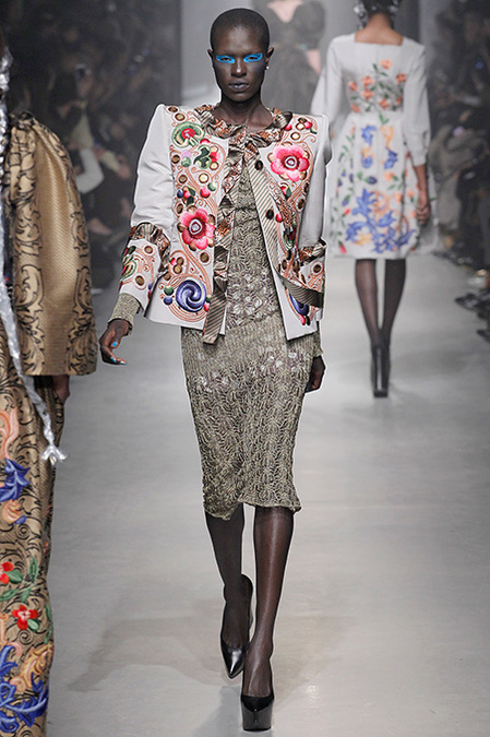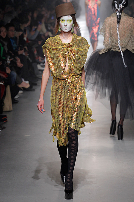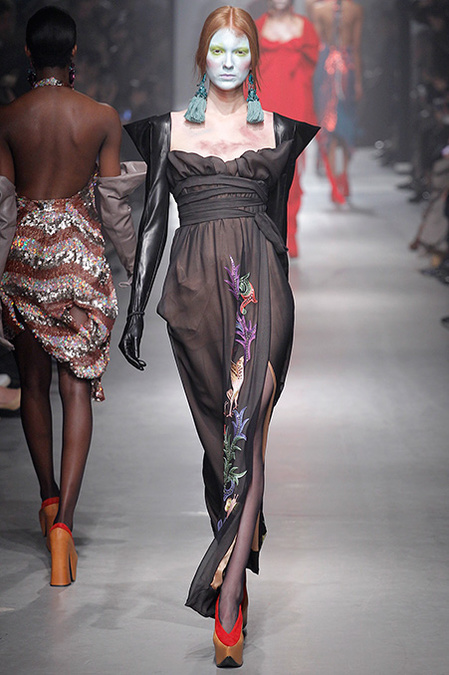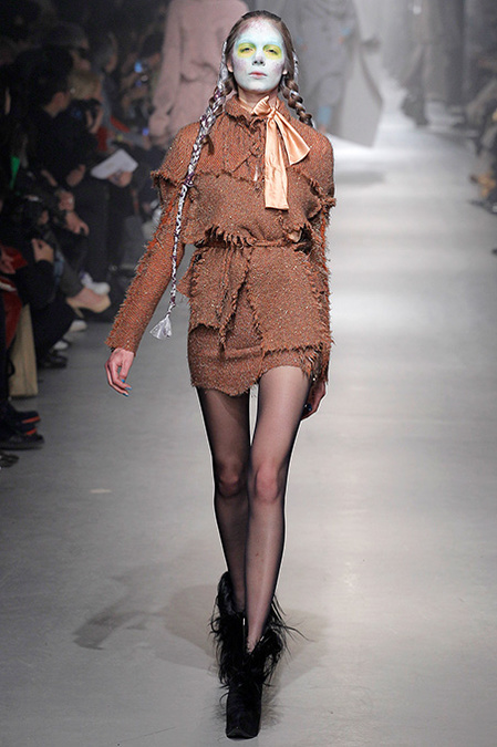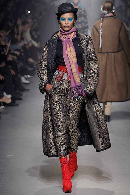 For the second time this week, a designer claimed inspiration from illuminated medieval manuscripts. First Cédric Charlier, now Vivienne Westwood. "When you go back in time, you also enter the future," quoth Dame Viv in her show manifesto. The cultural cross-pollination that occurred when the Crusaders returned to Europe after their rampage through the Arab world clearly connected with Westwood's own wayward design sensibility. Always one of fashion's great historicists, she literally wove medieval flora and fauna into her clothes.