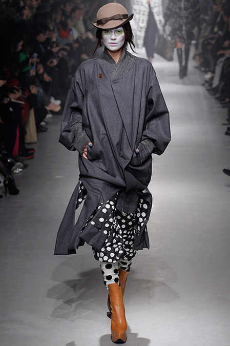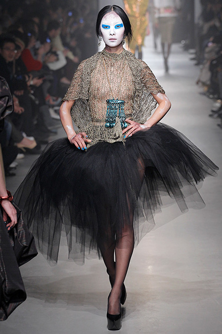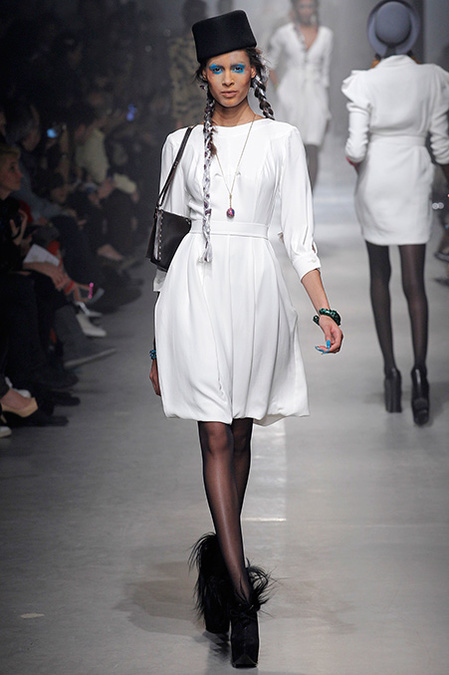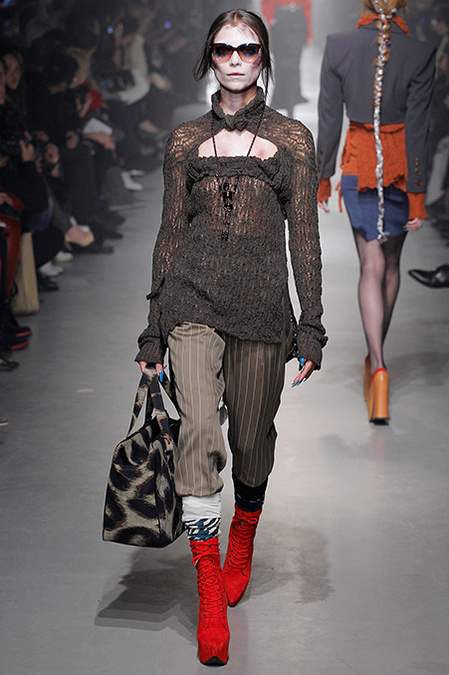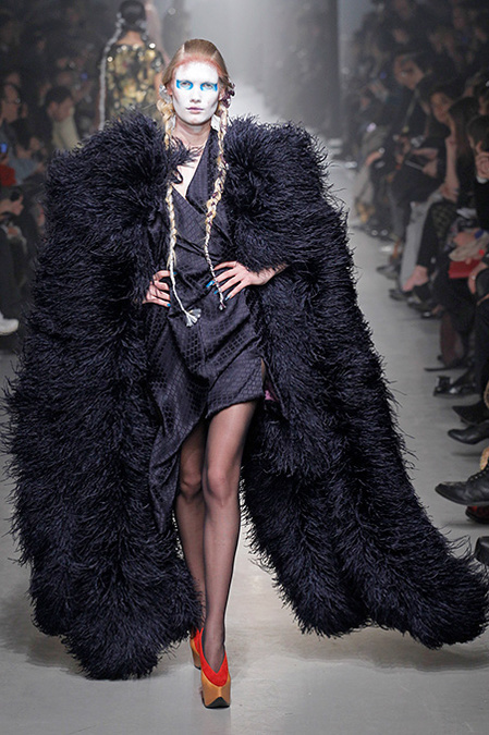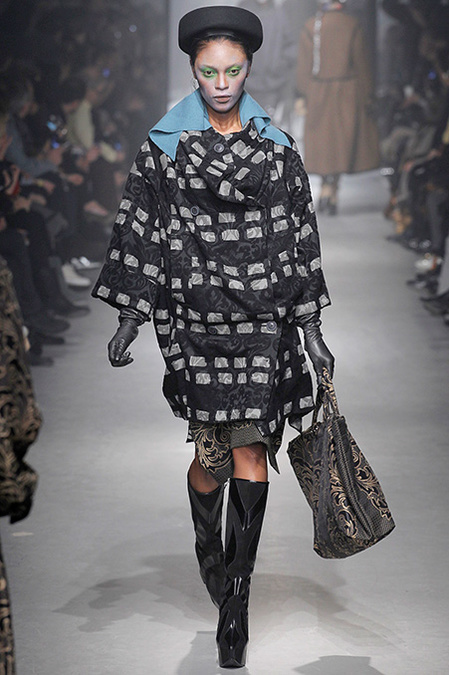 But where once she would have dwelled on the costume collection at the Victoria & Albert Museum for inspiration, now Westwood turns to Greenpeace. "Save the Arctic" was the rubric that ruled her latest collection. She convincingly detailed the urgency of this particular crisis in a fly sheet that awaited invitees. Hopefully everyone read it and absorbed the message, because, as usual, the farrago of fashion she showed wasn't particularly useful in clarifying her commitment.