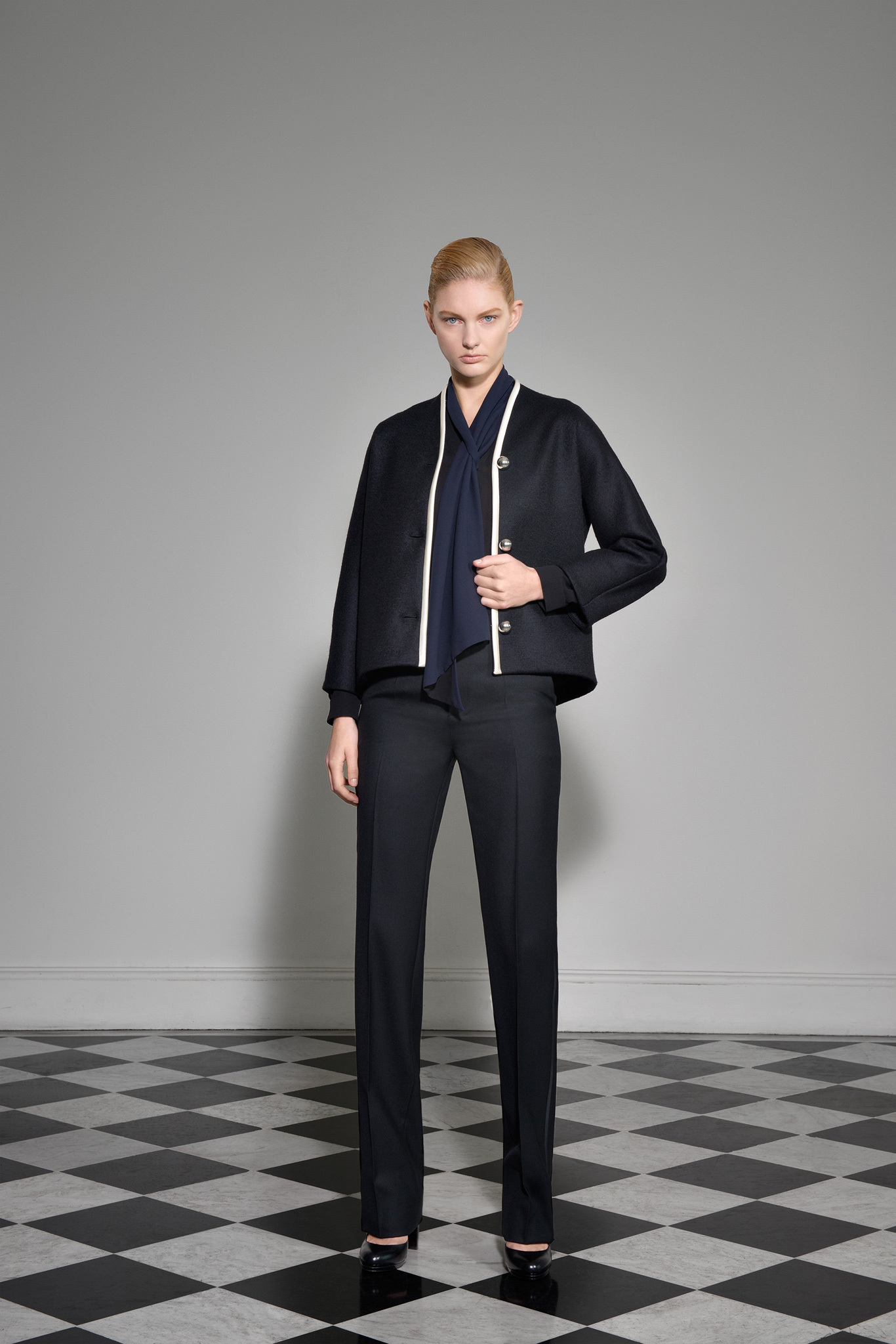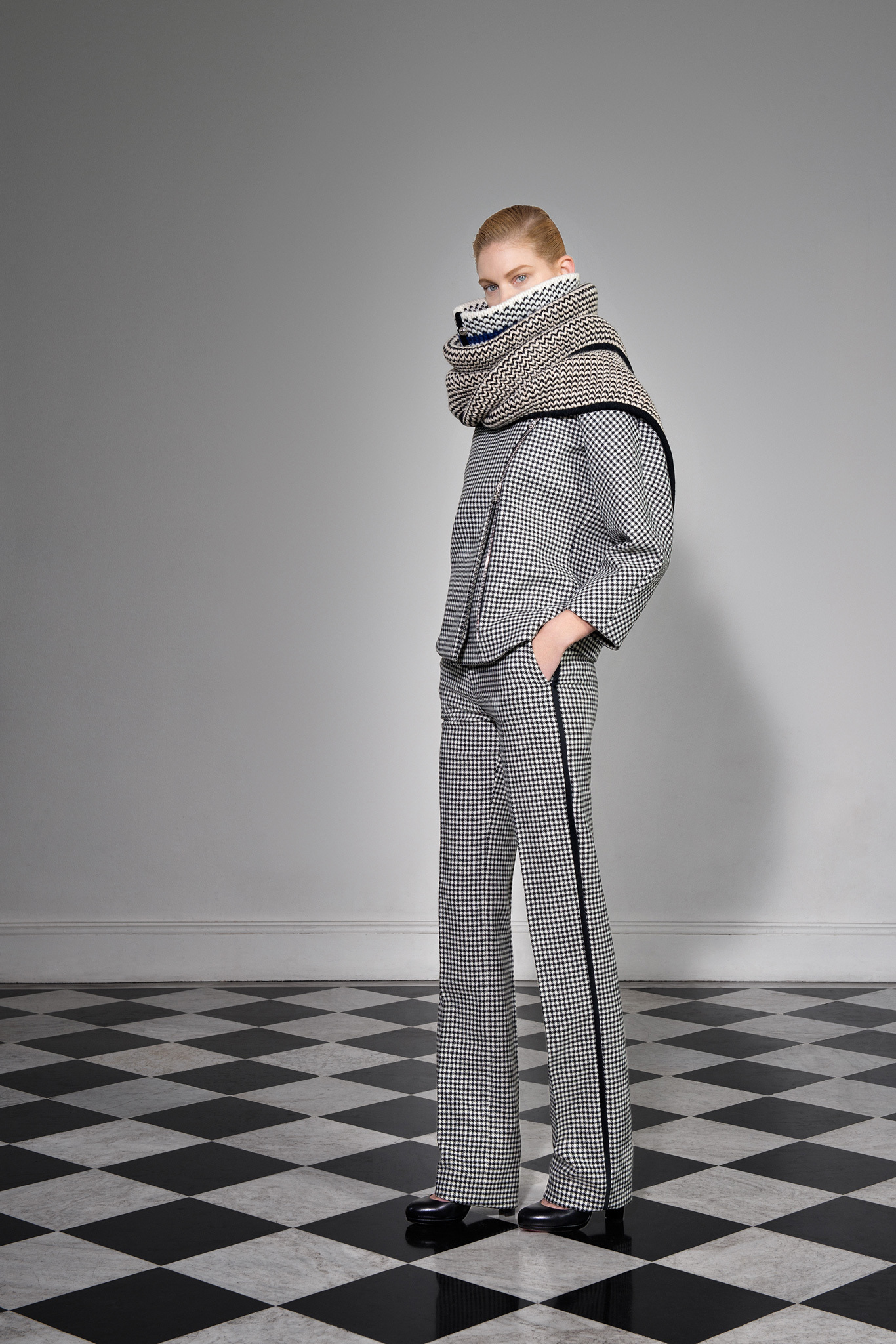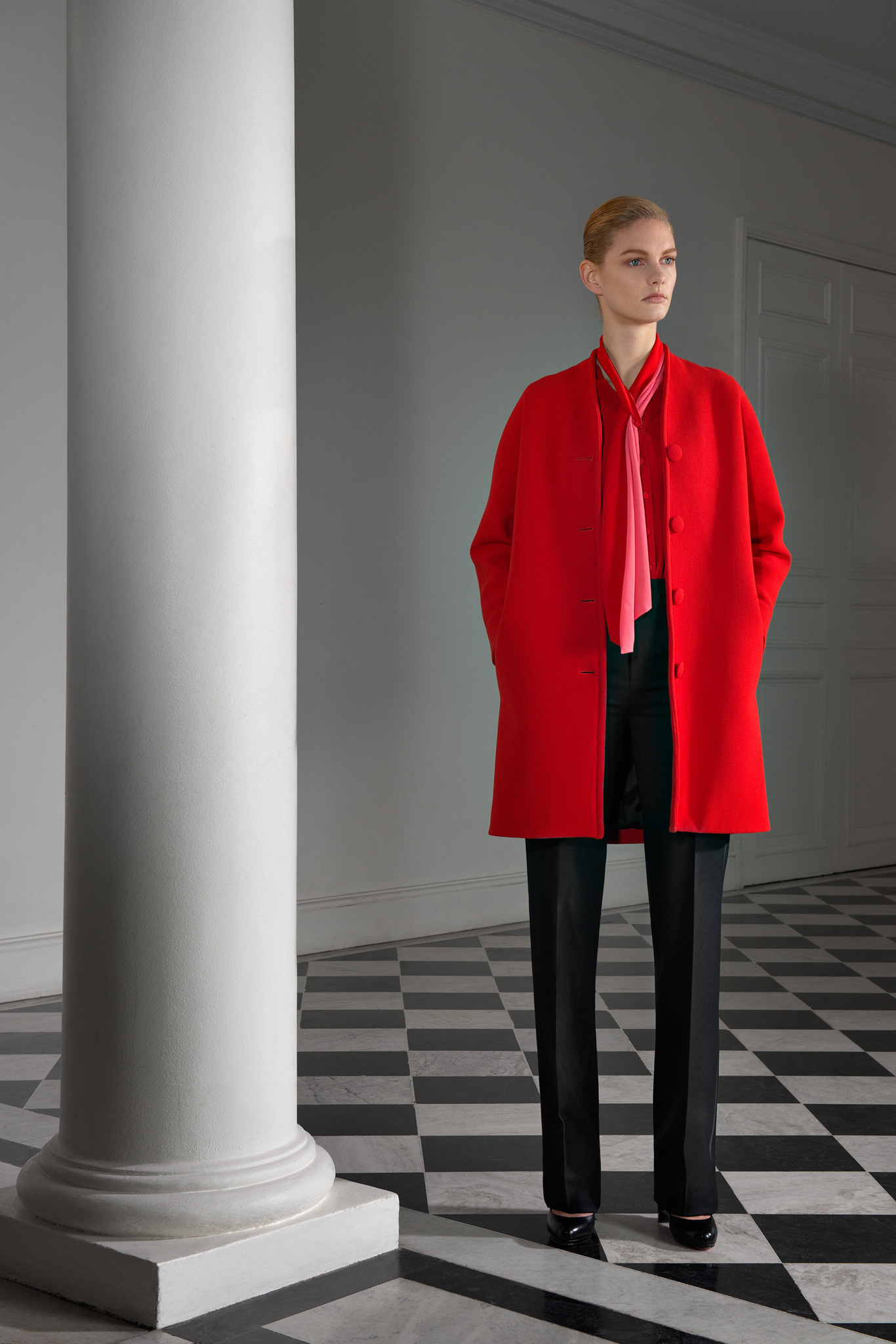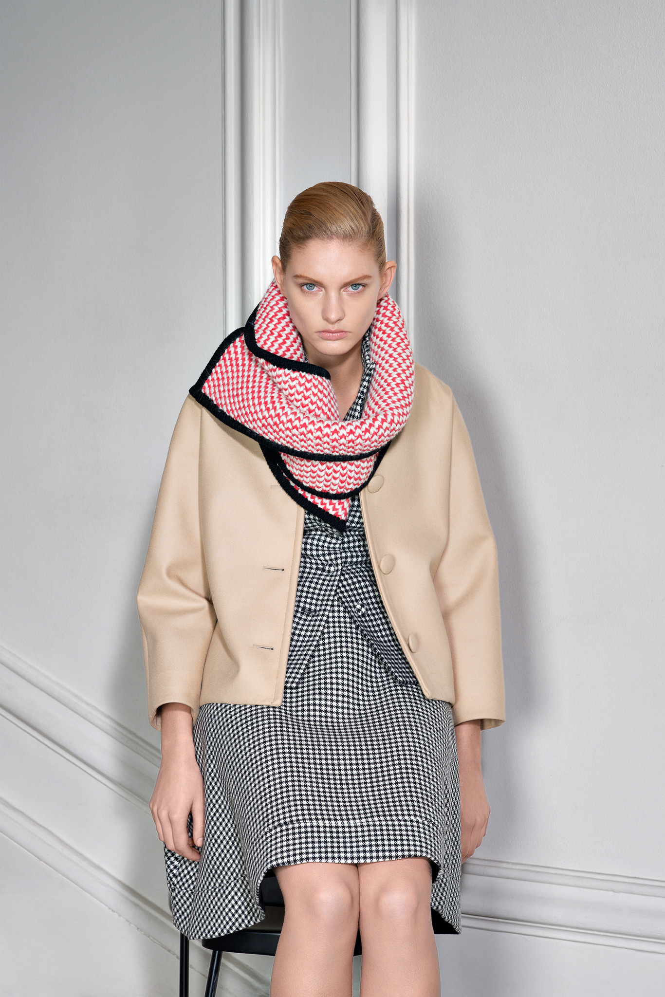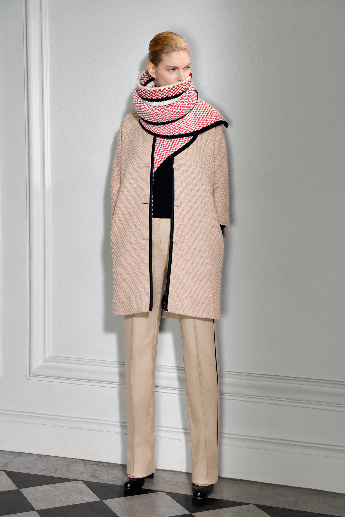 With outerwear so well represented in January, Jarrar's new collection was focused more on wardrobe basics like high-waisted pants, contrast-trim cardigans with deep shawl collars, and silk crepe blouses and dresses. Except that nothing is ever quite basic in Jarrar's hands, least of all a "total look" black and white checked pantsuit that she showed with a couple of her signature graphic scarves. The designer goes to great lengths to deliver uniqueness. The geranium red of a leather shift dress was specially made for her; same goes for the camel gabardine of her high-waisted pants. With Jarrar's profile on the rise, maybe it's time to move that January show a month back and combine those highly detailed clothes with the simpler ones here, so the larger crowds of ready-to-wear can see what the fuss is about.