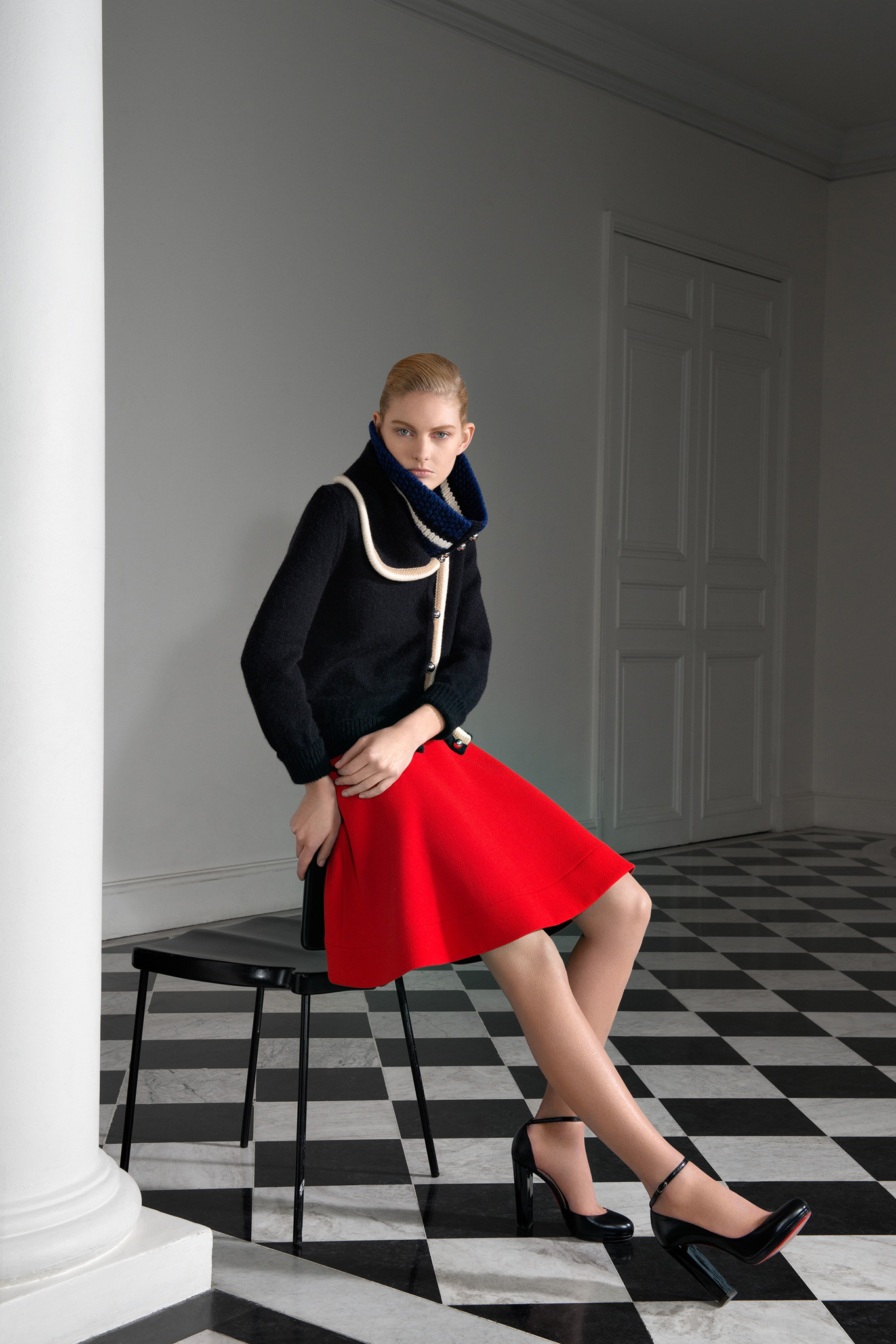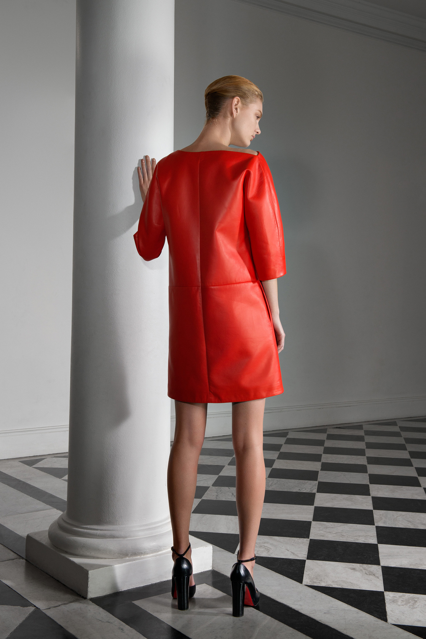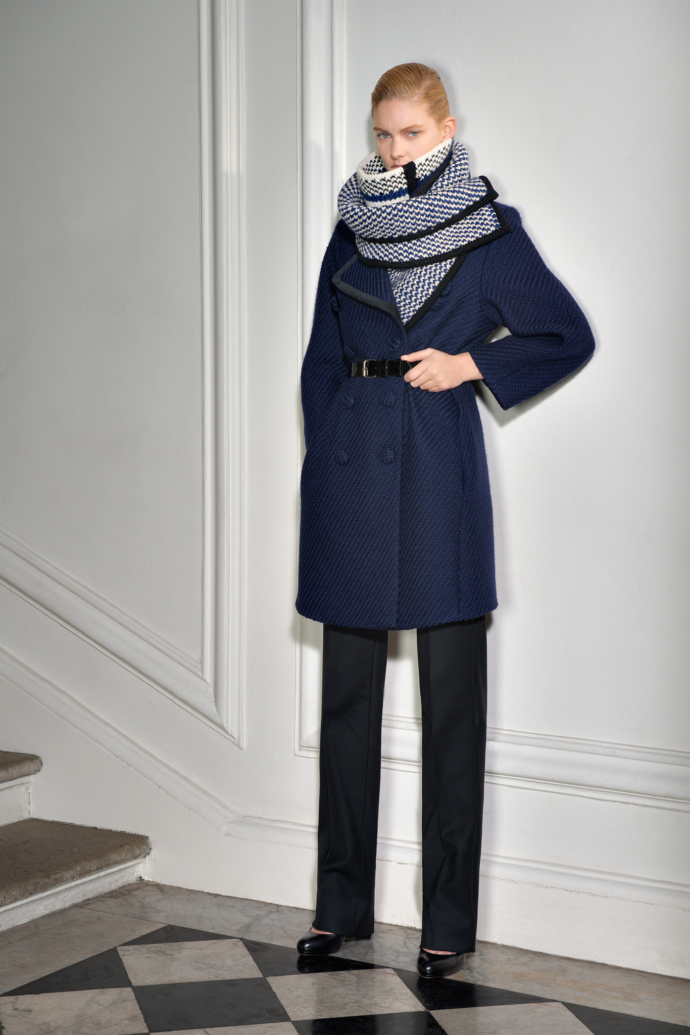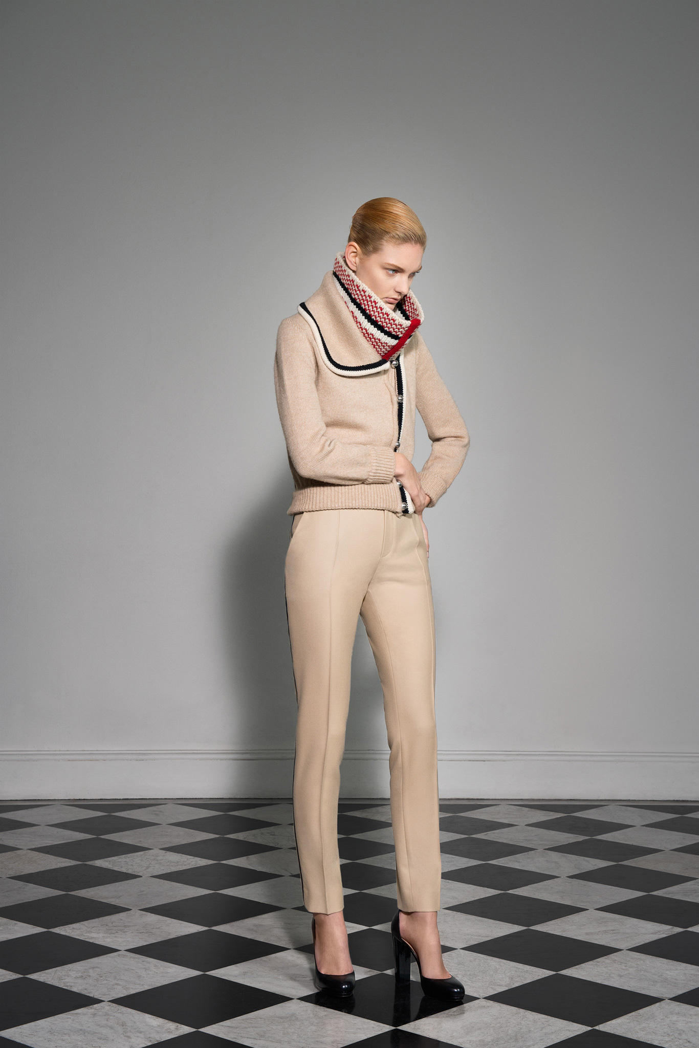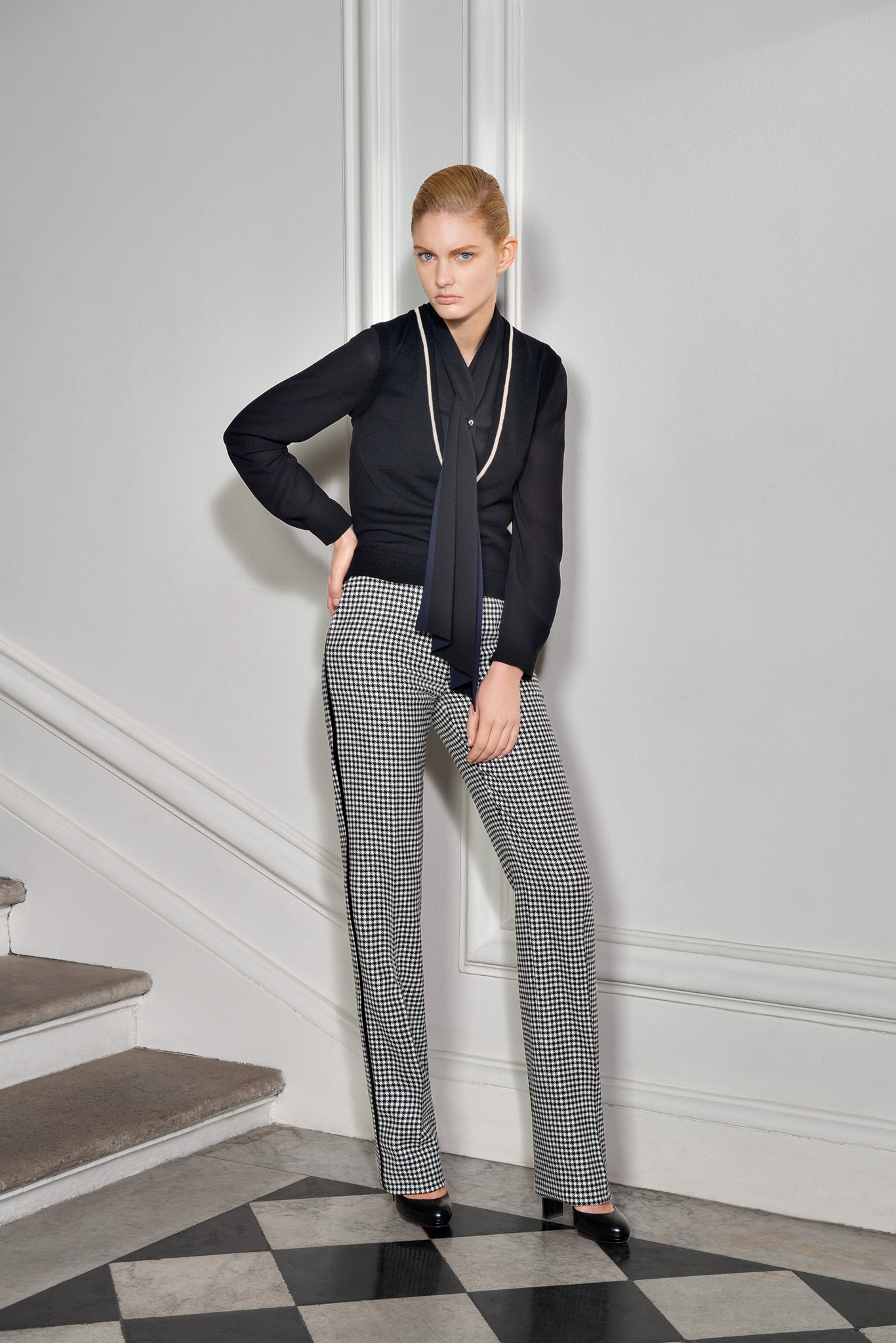 With outerwear so well represented in January, Jarrar's new collection was focused more on wardrobe basics like high-waisted pants, contrast-trim cardigans with deep shawl collars, and silk crepe blouses and dresses. Except that nothing is ever quite basic in Jarrar's hands, least of all a "total look" black and white checked pantsuit that she showed with a couple of her signature graphic scarves. The designer goes to great lengths to deliver uniqueness. The geranium red of a leather shift dress was specially made for her; same goes for the camel gabardine of her high-waisted pants. With Jarrar's profile on the rise, maybe it's time to move that January show a month back and combine those highly detailed clothes with the simpler ones here, so the larger crowds of ready-to-wear can see what the fuss is about.