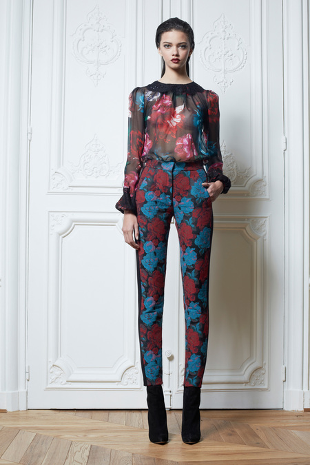 Murad was intent on conveying the message of "Gothic Renaissance," which he said included flowers painted by Jan van Eyck (never mind that the fifteenth-century Flemish artist is better known for his portrait of a turbaned man or a married couple named Arnolfini). Art history quibbles aside, jewel-toned flowers were at the heart of this collection, whether as elaborate sequined motifs or as printed clusters on a satin minidress. They were most interesting, however, on brocade tuxedo pants traced down the sides with black jersey and paired with a diaphanous chiffon blouse. It's easy to forget that Murad can—and does—do more than fancy frocks.