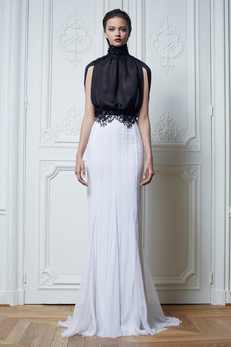 Murad had already explored bold, embellished florals in his Fall '13 Couture collection, and one of those dresses ended up on Kristen Stewart last September. On one hand, she's an unlikely ambassador for the brand. But Murad explained that this collection was all about the split personality: white guipure lace versus black leather, angel versus demon. Fashion doesn't need to be so binary, though. It can make as strong a statement by exploring the middle ground.