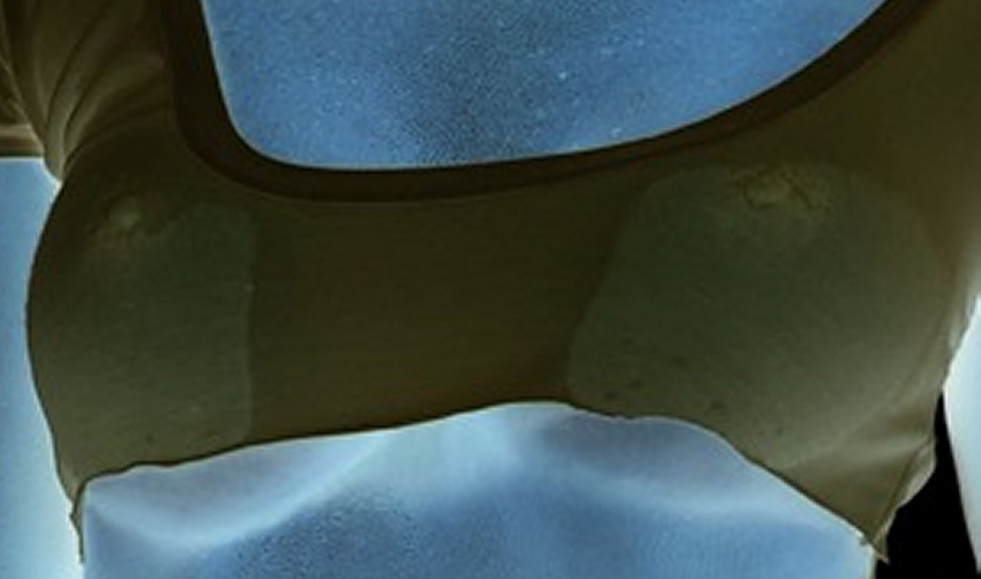(3) her breasts do not hang like natural breasts. They're asymmetrical and crooked. One is shaped like a bolt-on balloon, one is shaped like a football.
