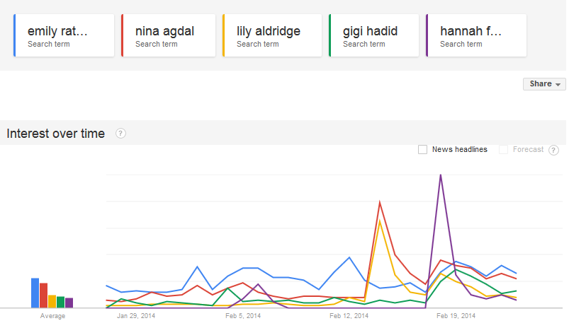on friday, february 14, the first day after the cover came out, nina and lily (red and yellow, respectively) got a huge bump, even going over emily ratajkowski (blue).