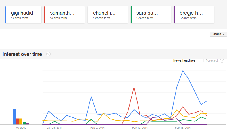 notice how these other girls (samantha, sara, chanel, and bregje) got relatively tiny bumps compared to gigi's, and gigi's was small compared to hannah and lily's. basically, the search interest for emily ratajkowski is like 50x that of bregje.