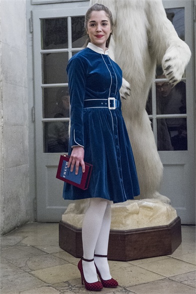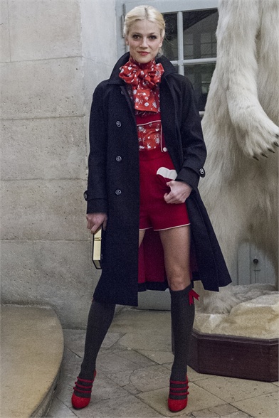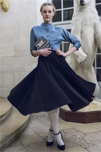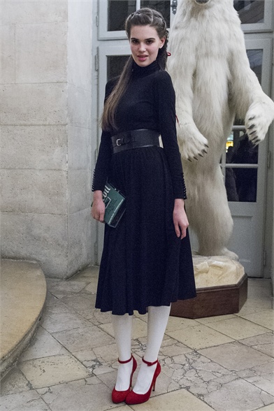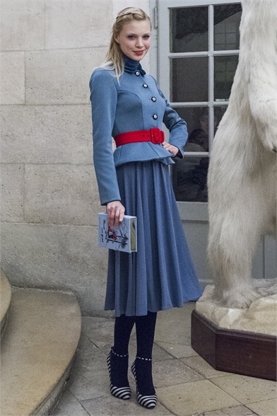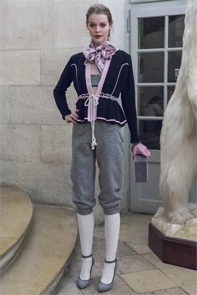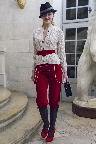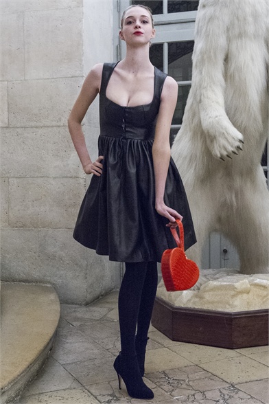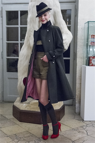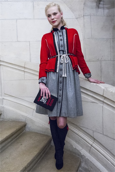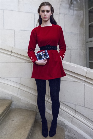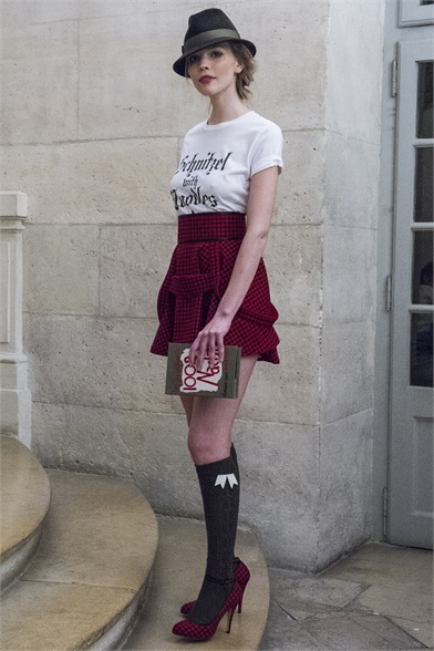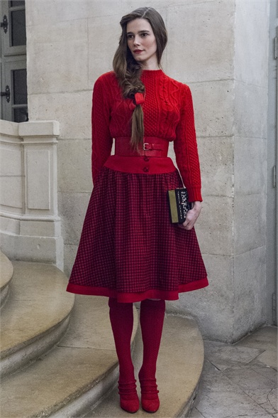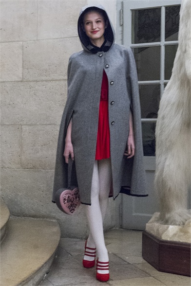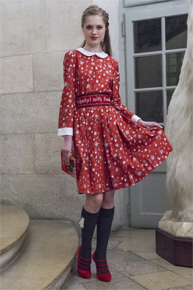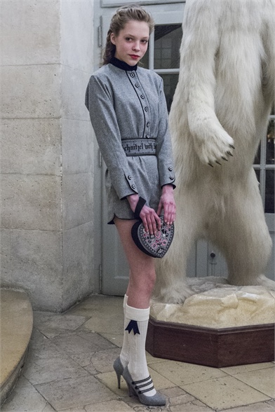 Let's start by stating the obvious: This Olympia Le-Tan collection was more than a little kitsch. How could it not be, with an inspiration like The Sound of Music? There were lederhosen-inspired looks and belts that said "Schnitzel with Noodles," a callout to a line in the song "My Favorite Things." So, yes, Le-Tan was in a typically whimsical mood this season, and bless her for that. The interesting news here, meanwhile, was the fact that this collection was not all that silly. A woman would not have to possess a well-defined sense of irony to like, and wear, Le-Tan's sharply cut loden coats with embroidered buttons, or her flattering full skirts made from sensuous French jersey. Elsewhere, a Peter Pan-collar dress in a print designed by Le-Tan's father, Pierre Le-Tan, did err on the side of the twee, which was the nature of its charm; likewise, her nipped-waist cardigans were irresistibly sweet. Even the lederhosen-inspired looks were remarkably convincing: A velvet romper, for instance, didn't come off costumey and seemed like perfectly viable partywear for a moderately nervy hipster. (A pair of leather shorts with suspenders and a heart cutout over the bum, meanwhile, would require a more than moderate level of nerviness.) On the whole, this collection was more convincingly realistic than it should have been. It got to you, like that ridiculous movie about a nun who teaches a bunch of children to sing.