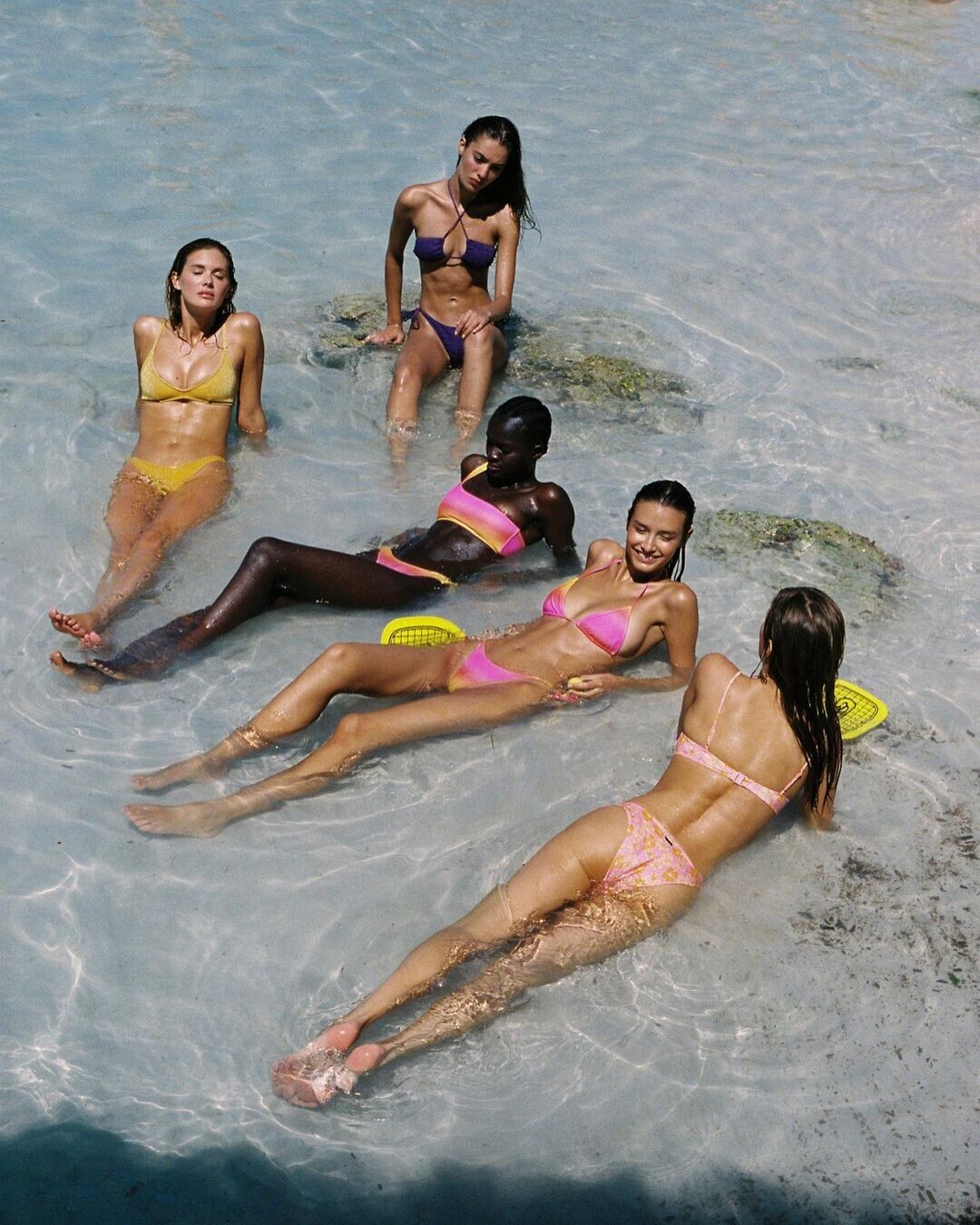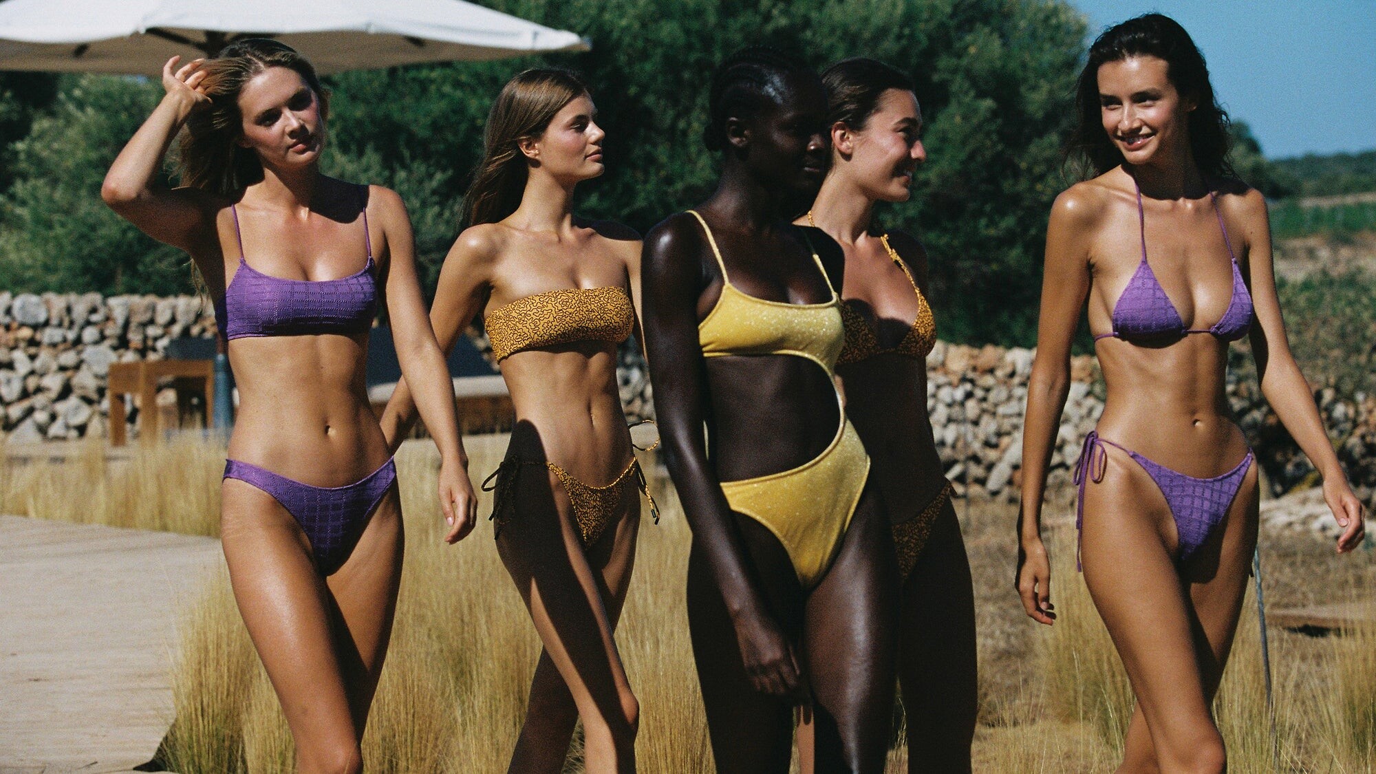 Myrthe Bolt, Megan Williams, Claudia Vega, Mariia Derevianko and Tosin Iyanuoluwa in Triangl 'Fontenille' collection photographed by Jonny Seelenmeyer