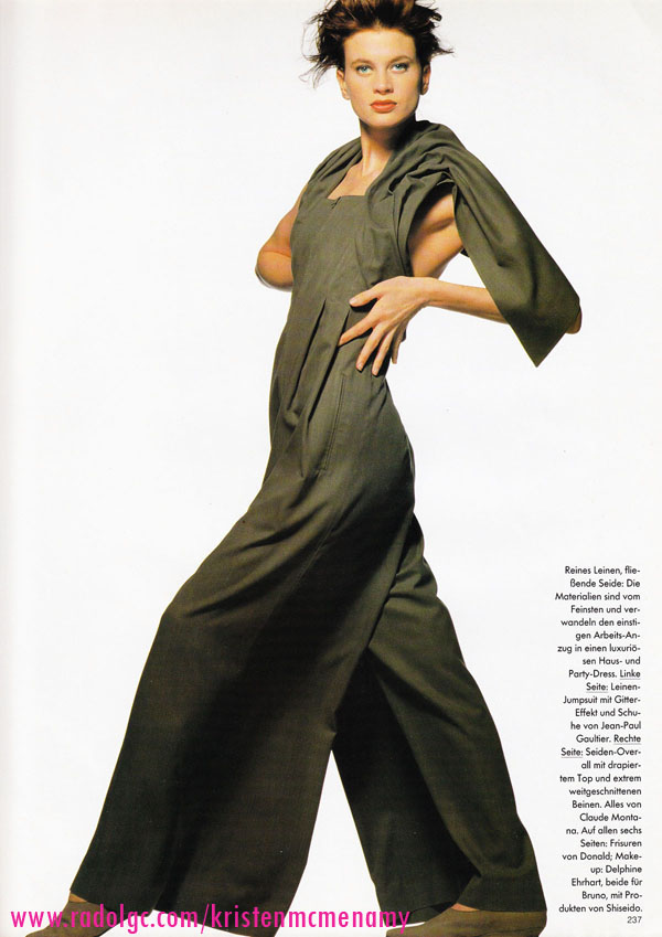 Vogue Germany April 1989 "Overall" Model: Kristen McMenamy Photographer: Walter Chin Hair: Donald Makeup: Delphine Ehrhart