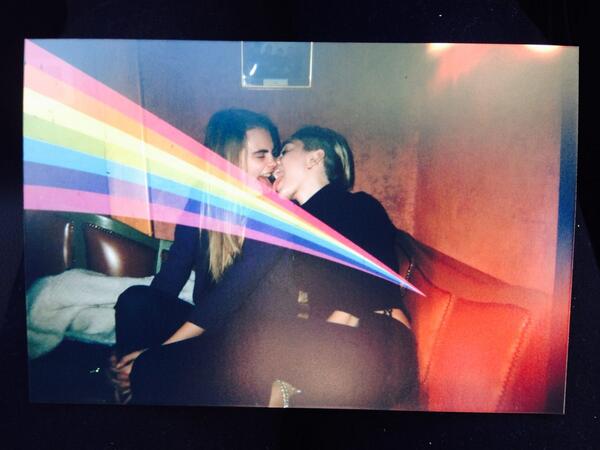 Oh, it's just Miley Cyrus, being her usual tongue-wagging self as she posed tongues out with Victoria's Secret model Cara Delevingne. In a photo the "We Can't Stop" singer posted on her Twitter page Thursday (Dec. 26), Cyrus can be seen kissing the English fashion model on a couch, with a rainbow graphic superimposed on top. "LOVE!!!!! We finally got the filmed developed Mush," Cyrus wrote.