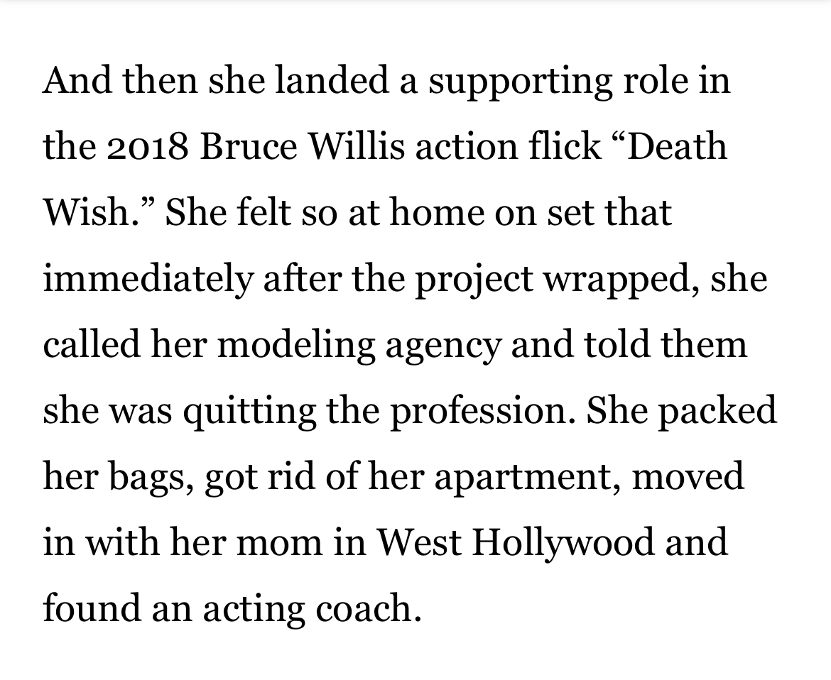 On 4/22/2021 at 10:56 PM, Coco2020 said:Basically both. She did an interview with the LA Times & said she was pressured to lose weight as a model then she auditioned for Eli Roth’s film Death Wish & got the part (likely because Eli’s a close family friend through her stepfather at the time Al Pacino). Then she quit modeling & started focusing on acting. I think she is decent. Also you mean Argentina’s Vogue? Cause she’s never been on Vogue US.