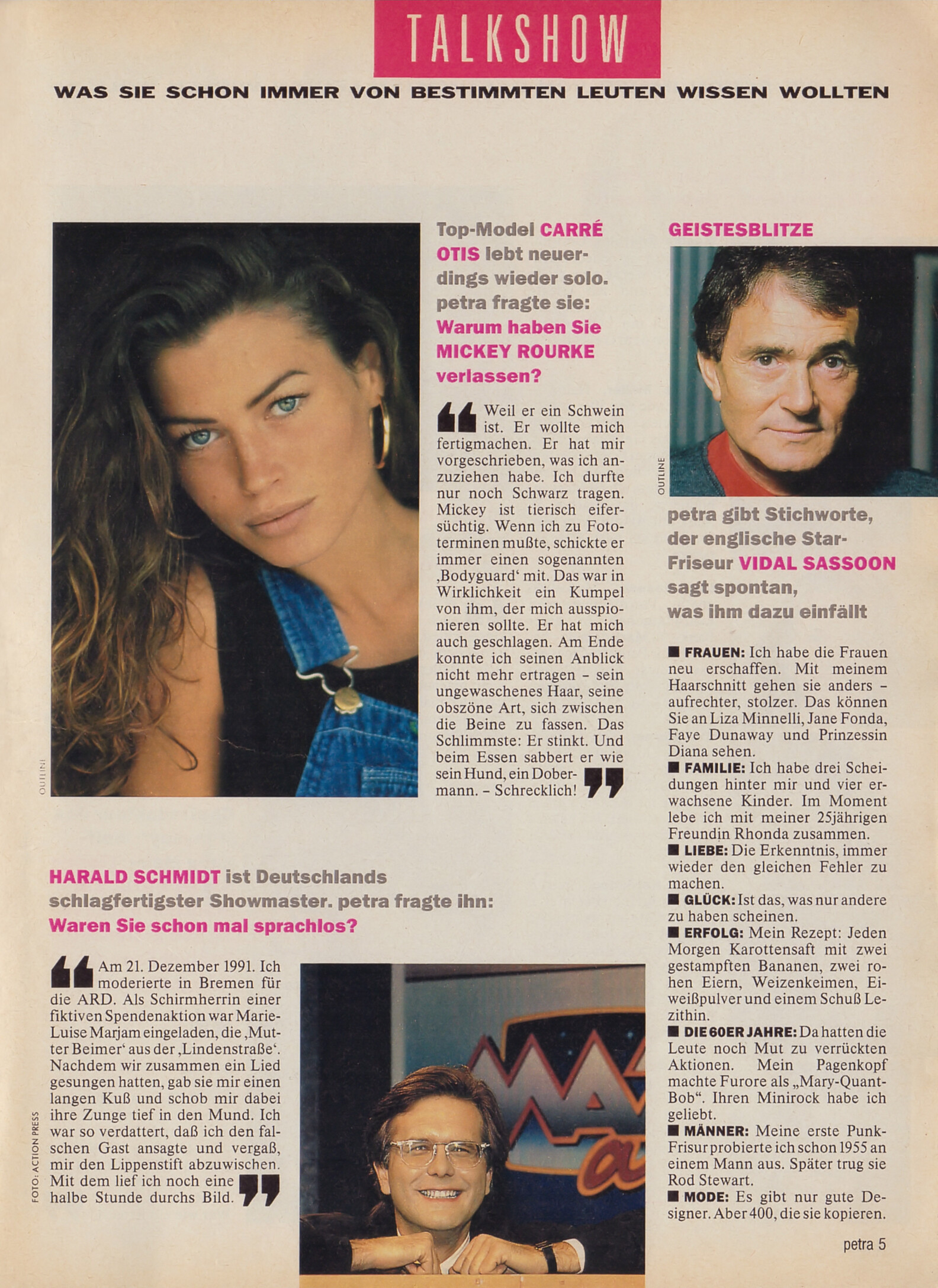 "TALKSHOW Top-Model CARRÈ OTIS lebt neuerdings wieder solo." - petra Germany July 1992 (29. June 1992) - also showing Vidal Sassoon, Harald Schmidt