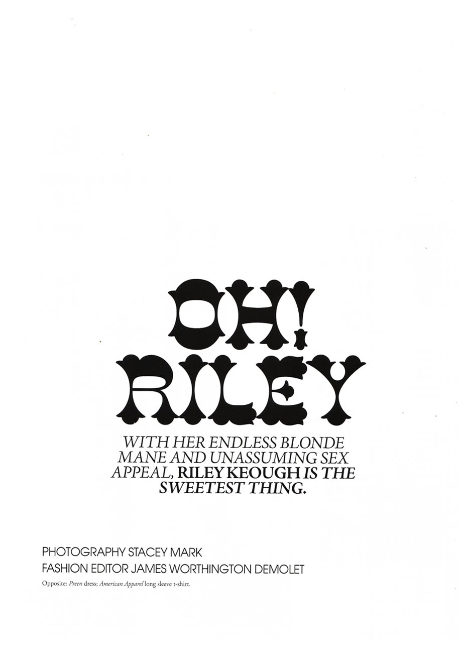 What’s on tap for this kicked-back stunner? Well besides finishing up high-school, modeling (she’s repped by IMG), and hanging with her beau Ryan Cabrera, Riley (like your overly excited editors) is anticipating the upcoming summer music festivals. Read on for her suggestions on what to wear to Coachella, her personal style tips, and the secret contents of her handbag…