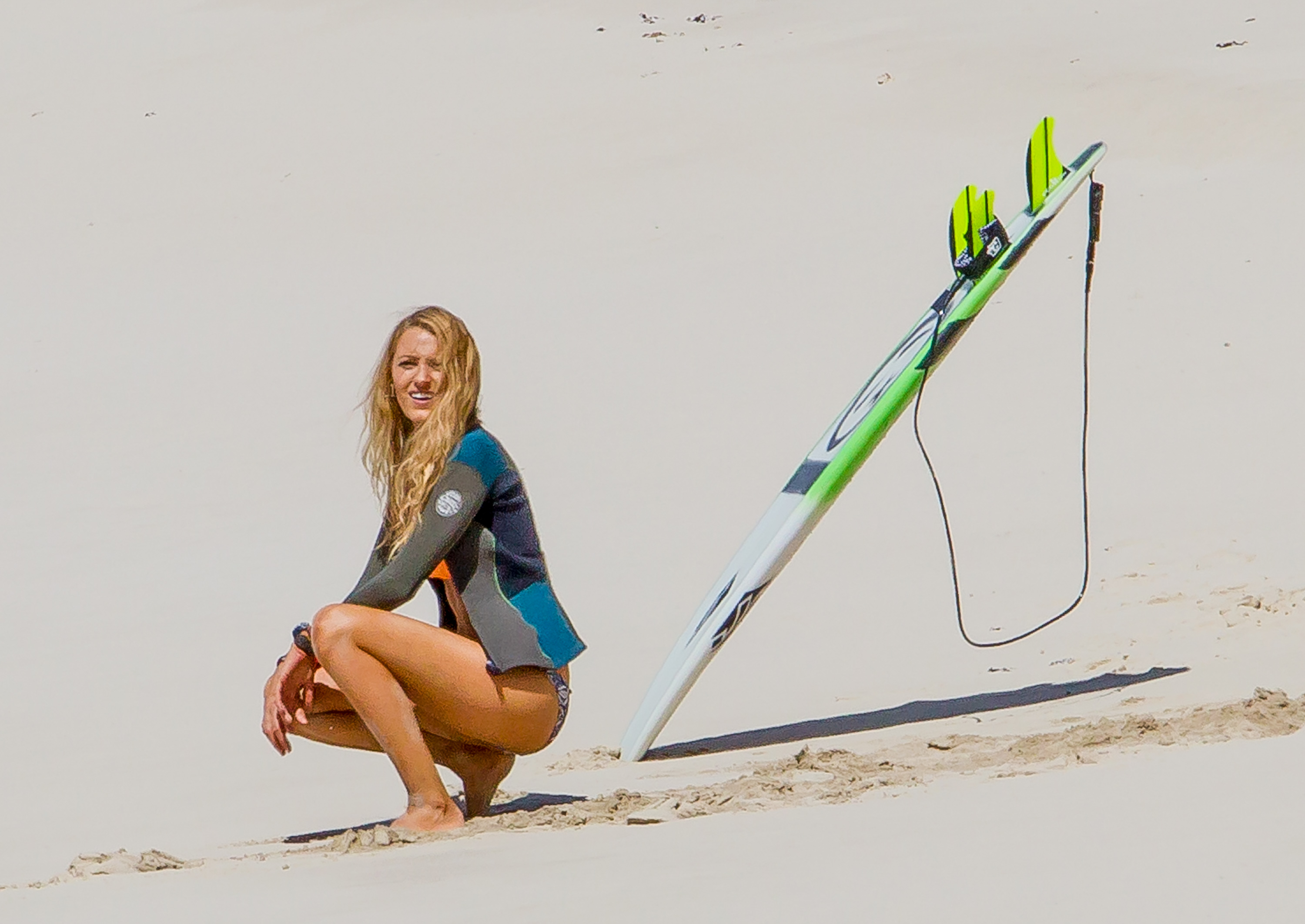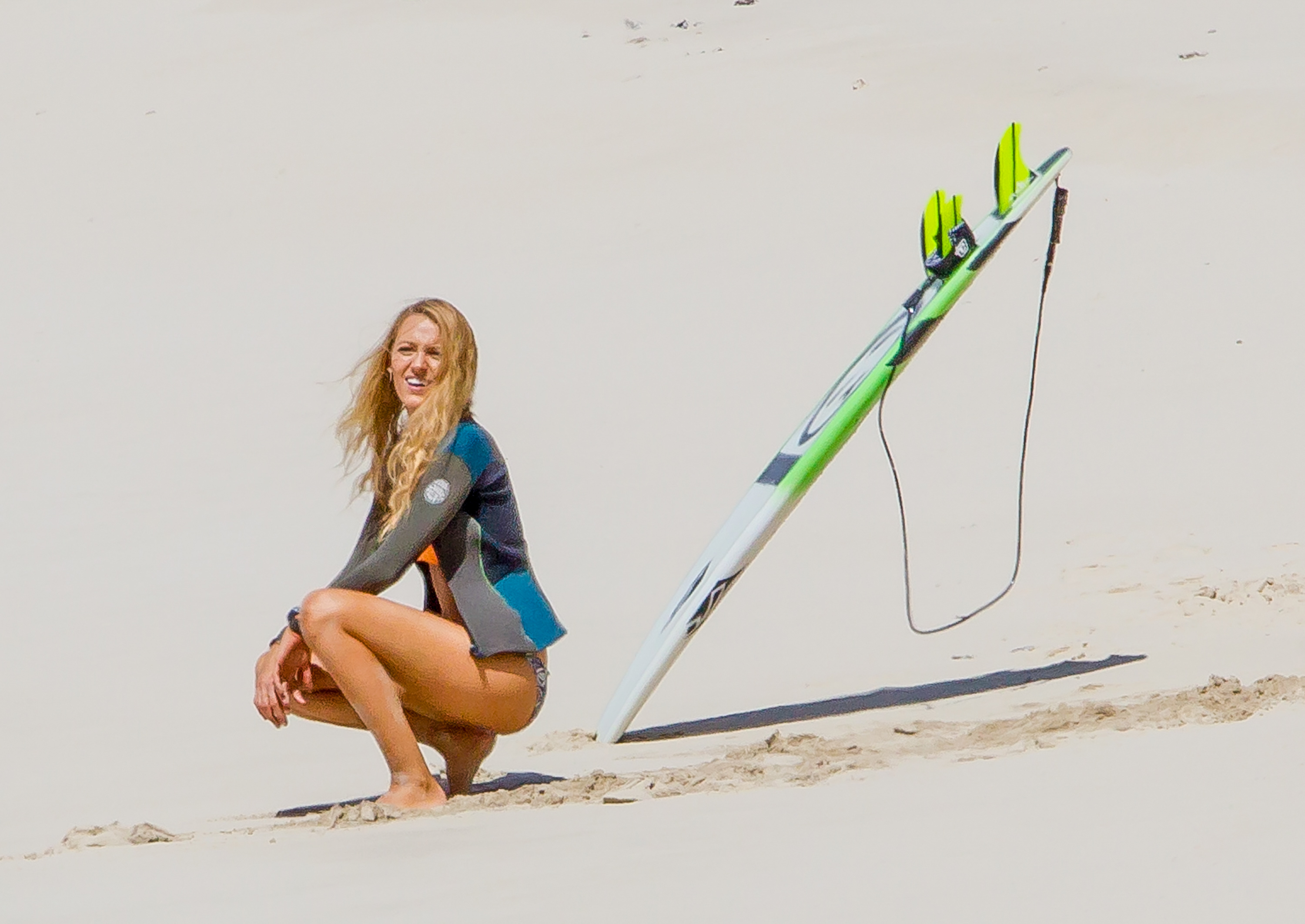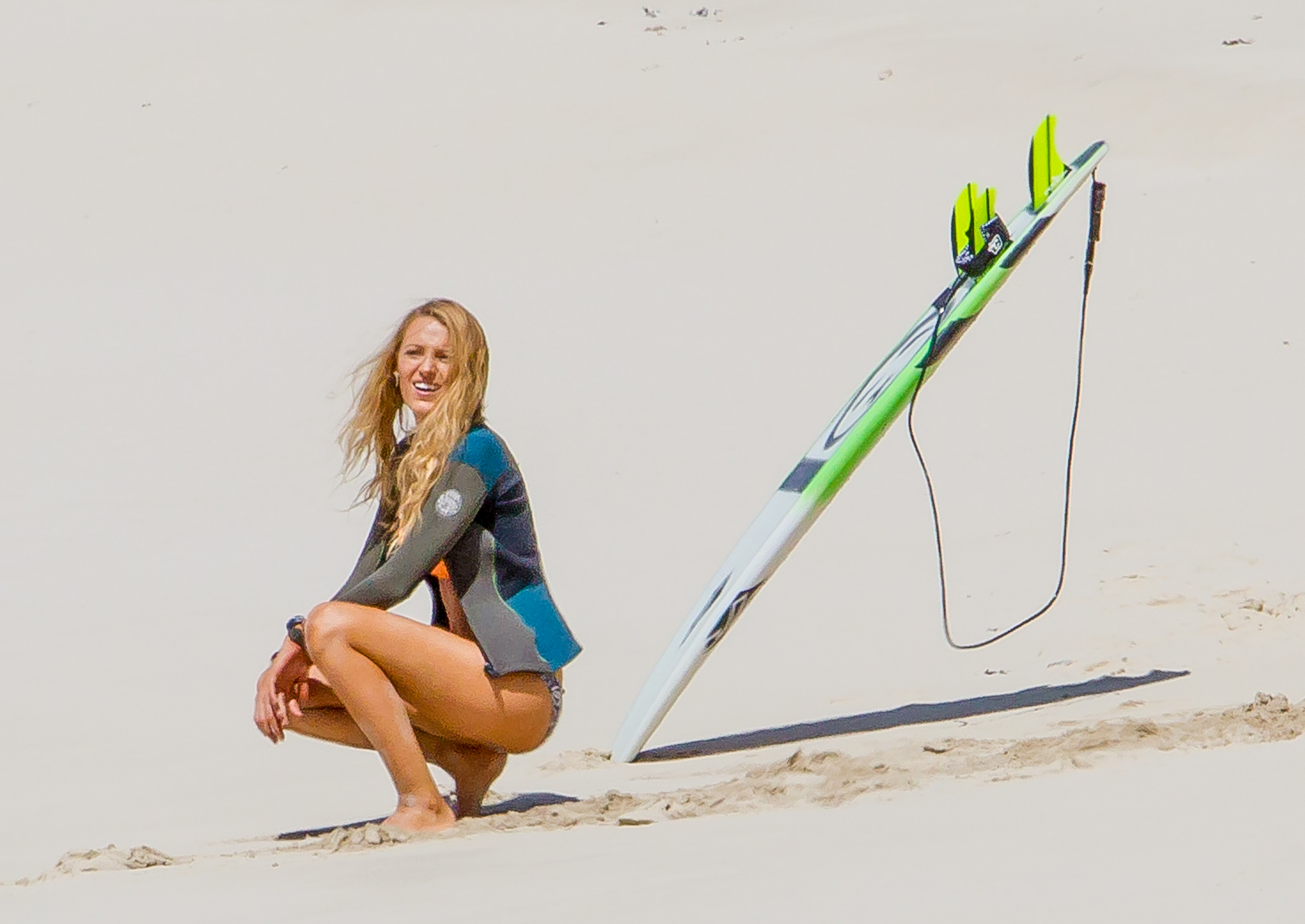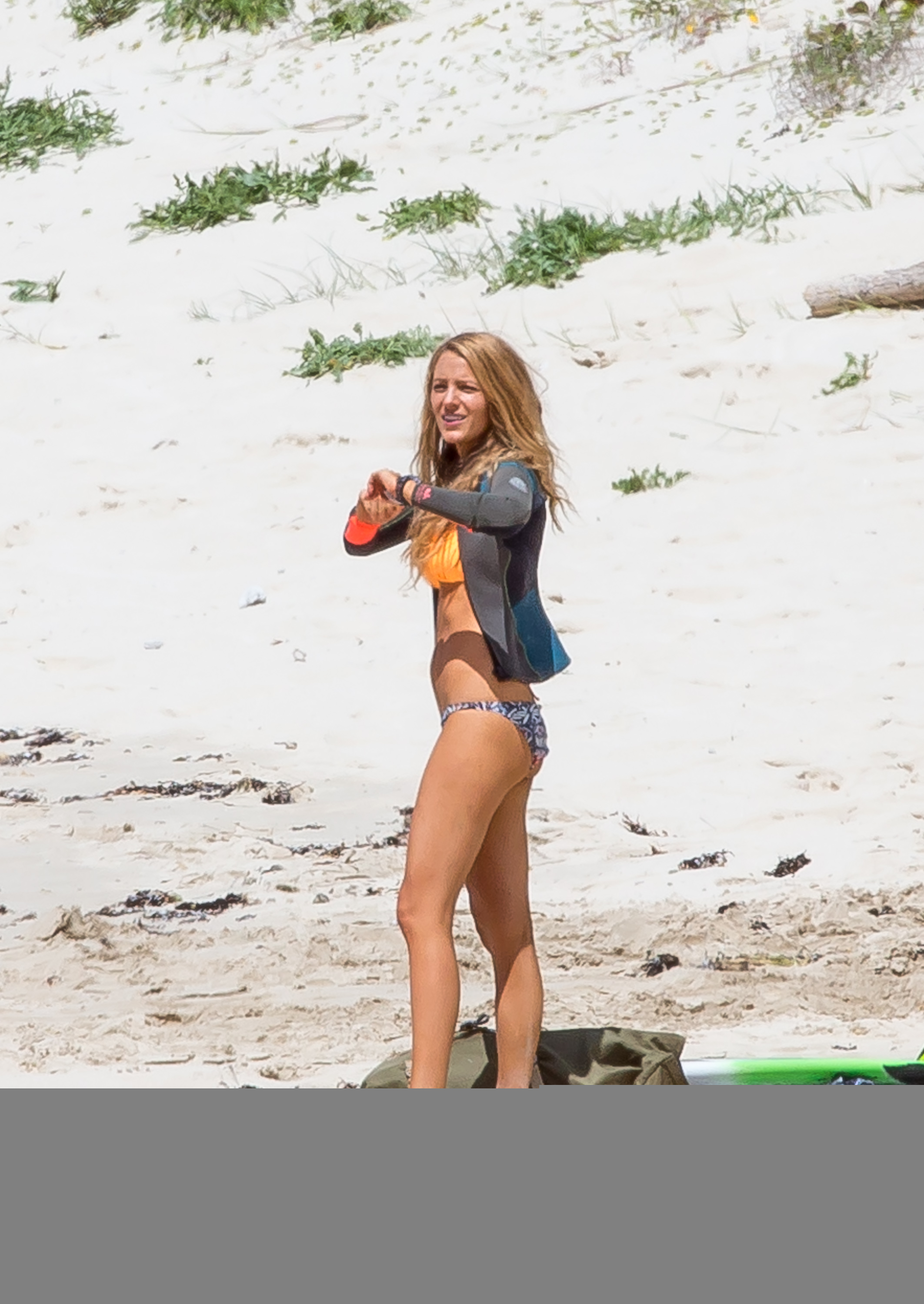 The actress was photographed on the set of her new movie, The Shallows, in Lord Howe Island in New South Wales, Australia, late last week. Blake looked toned and tanned in a yellow-orange triangle top and printed bottoms as she filmed scenes on the beach. At various points during the outdoor shoot, she covered up by wearing jean shorts, a long sleeved sweater or a wetsuit jacket.