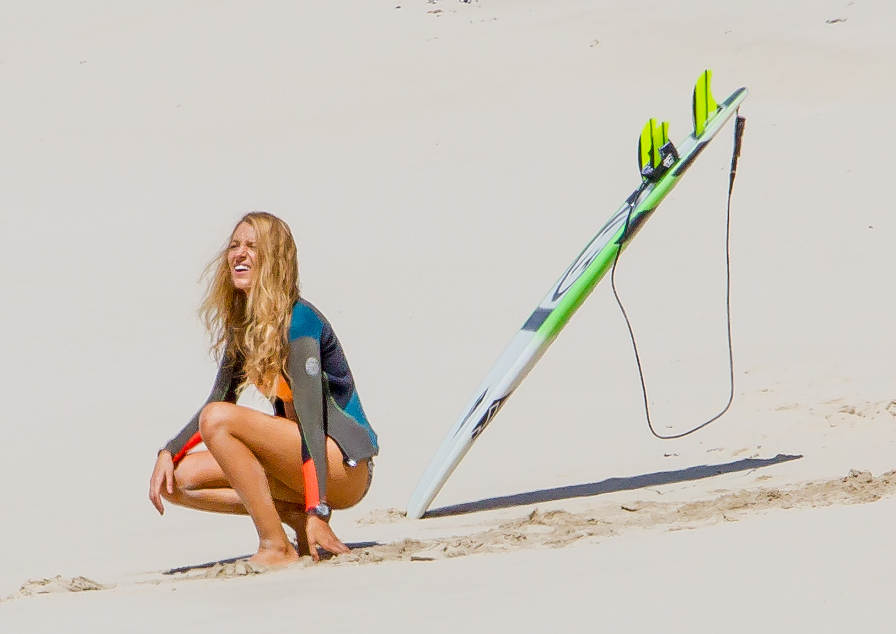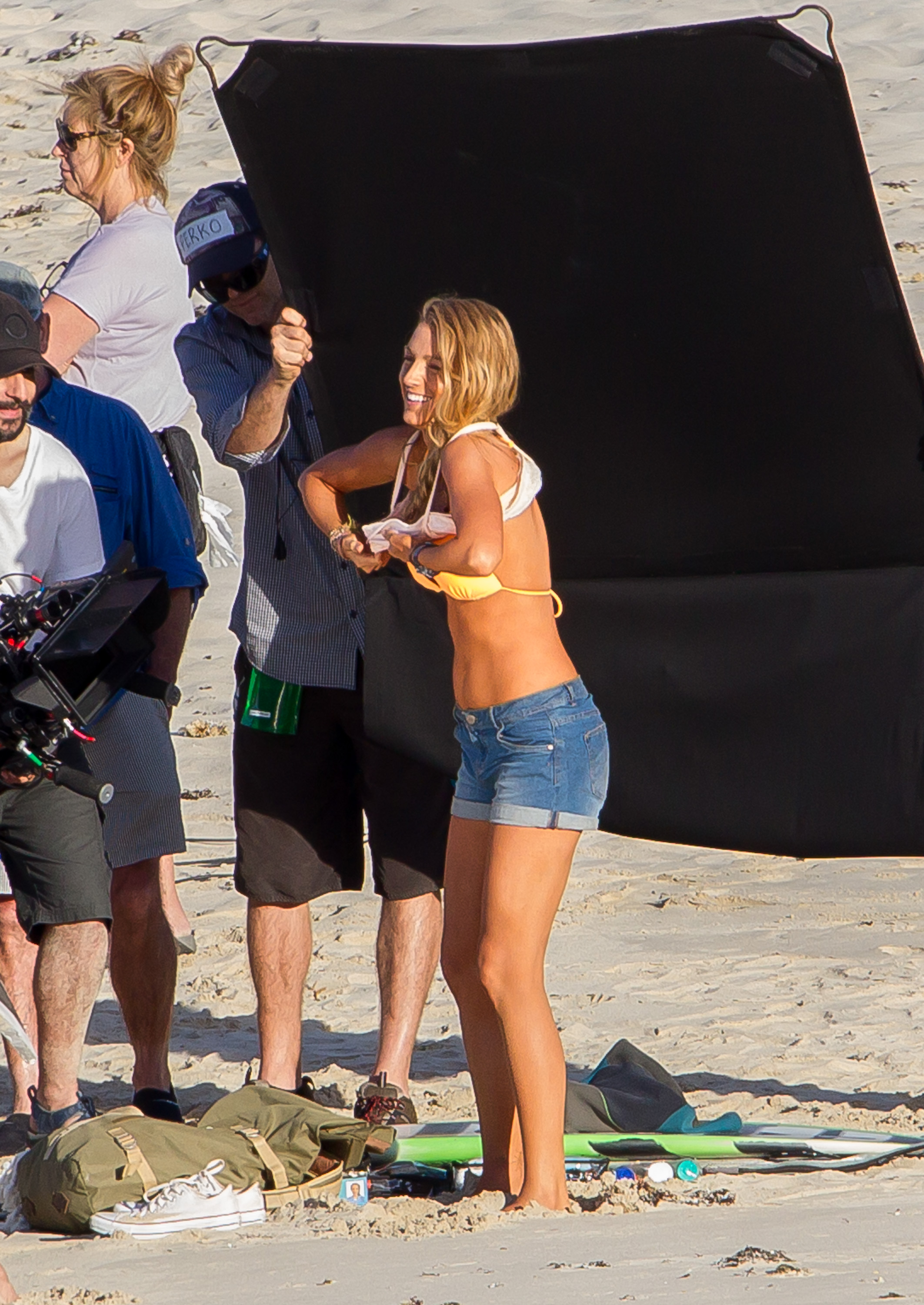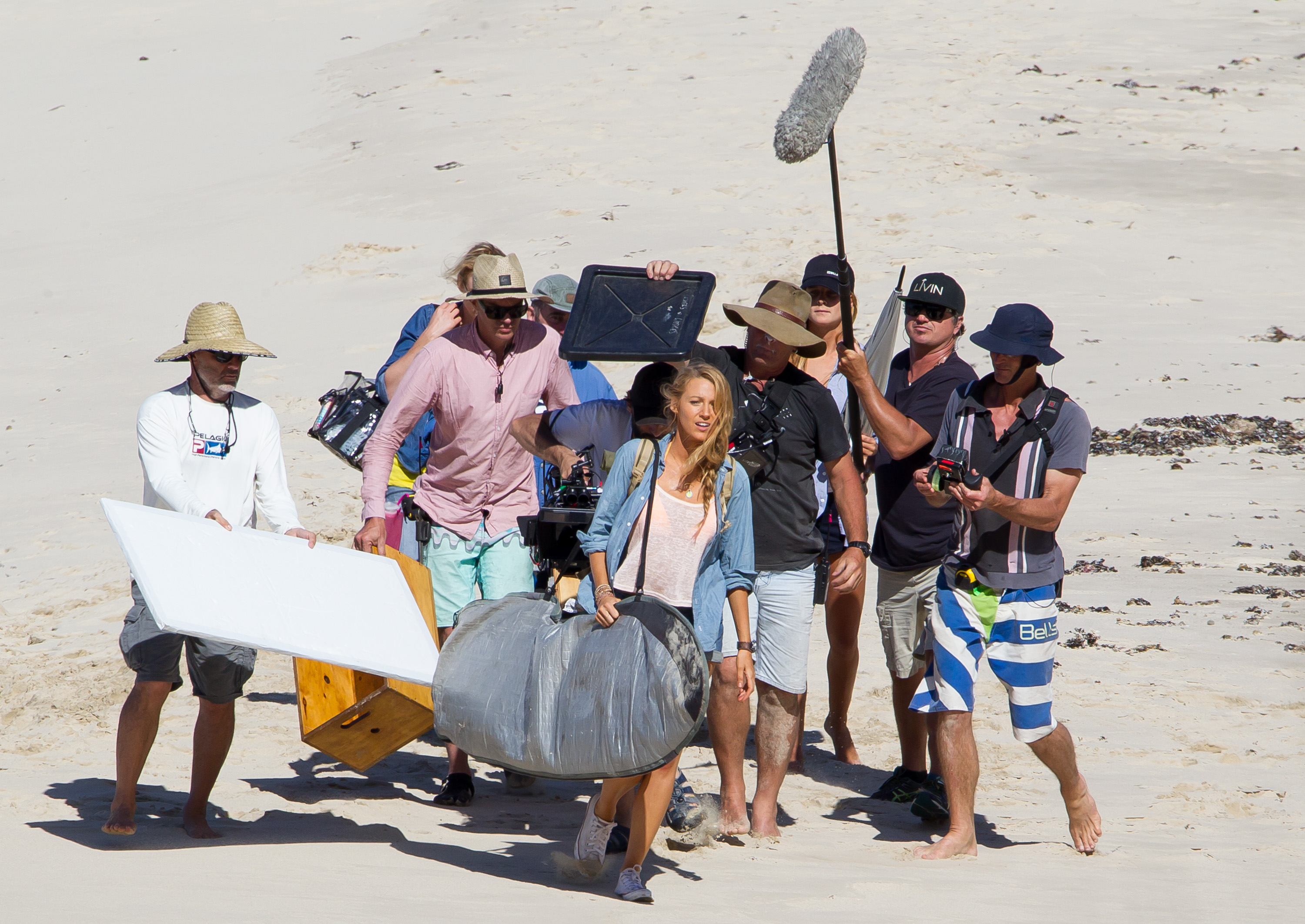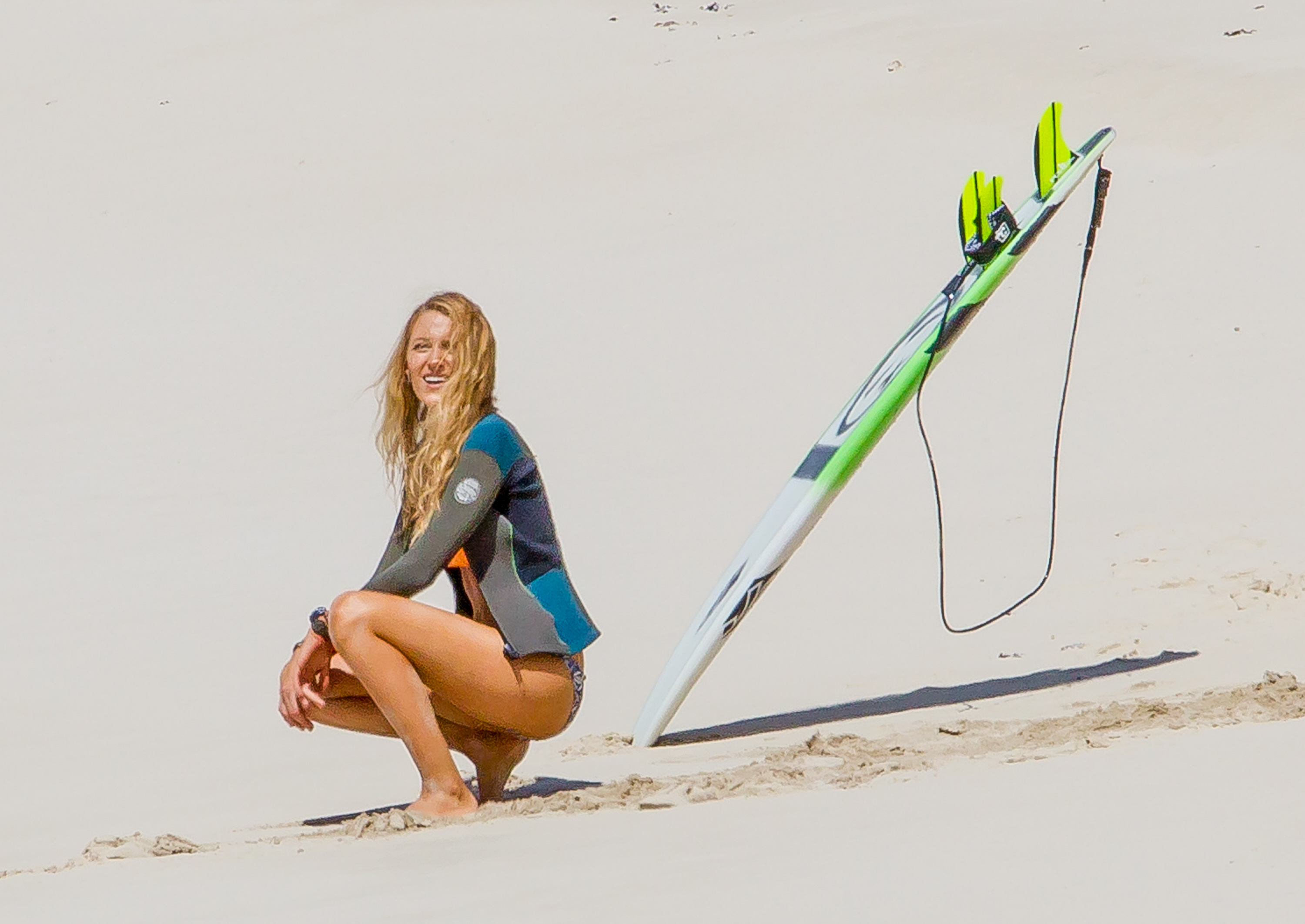 The actress was photographed on the set of her new movie, The Shallows, in Lord Howe Island in New South Wales, Australia, late last week. Blake looked toned and tanned in a yellow-orange triangle top and printed bottoms as she filmed scenes on the beach. At various points during the outdoor shoot, she covered up by wearing jean shorts, a long sleeved sweater or a wetsuit jacket.