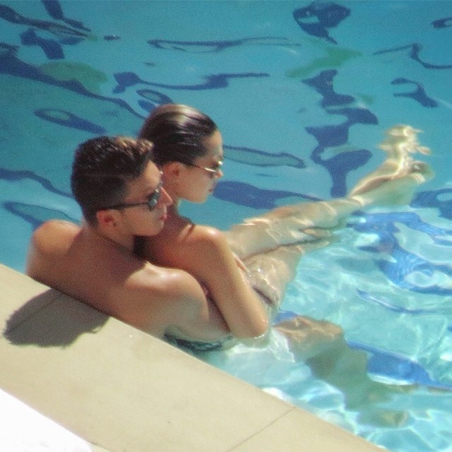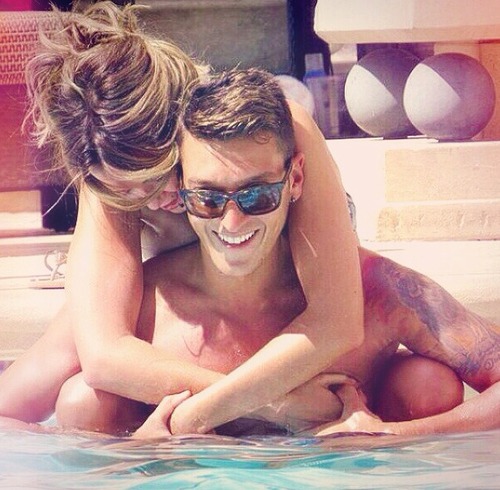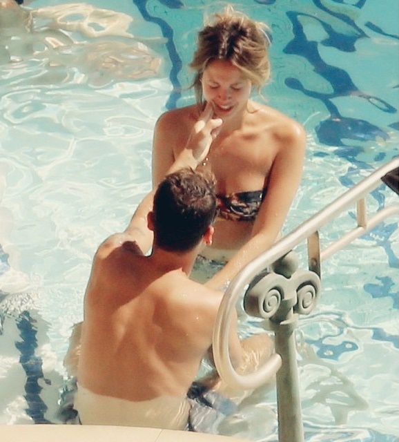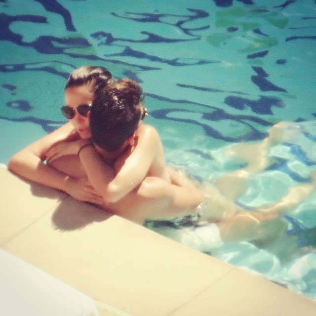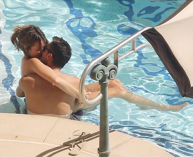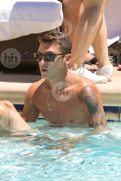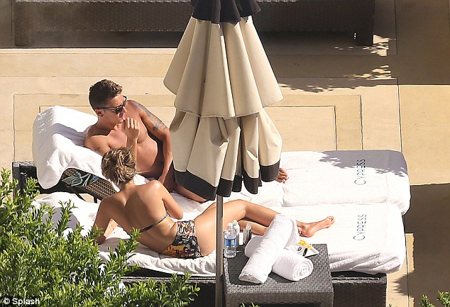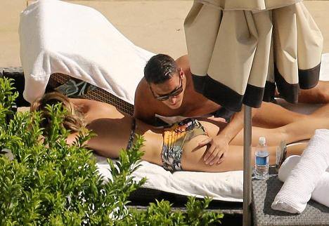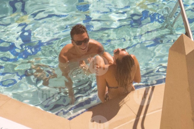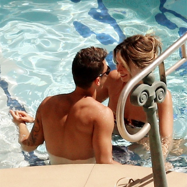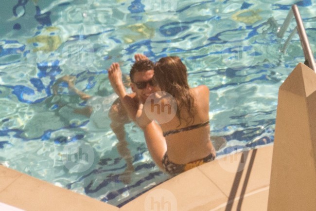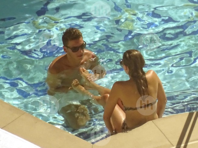 Mesut Ozil and Mandy Capristo are spotted relaxing and getting affectionate by the pool of their hotel in is Las Vegas on July 27, 2014.