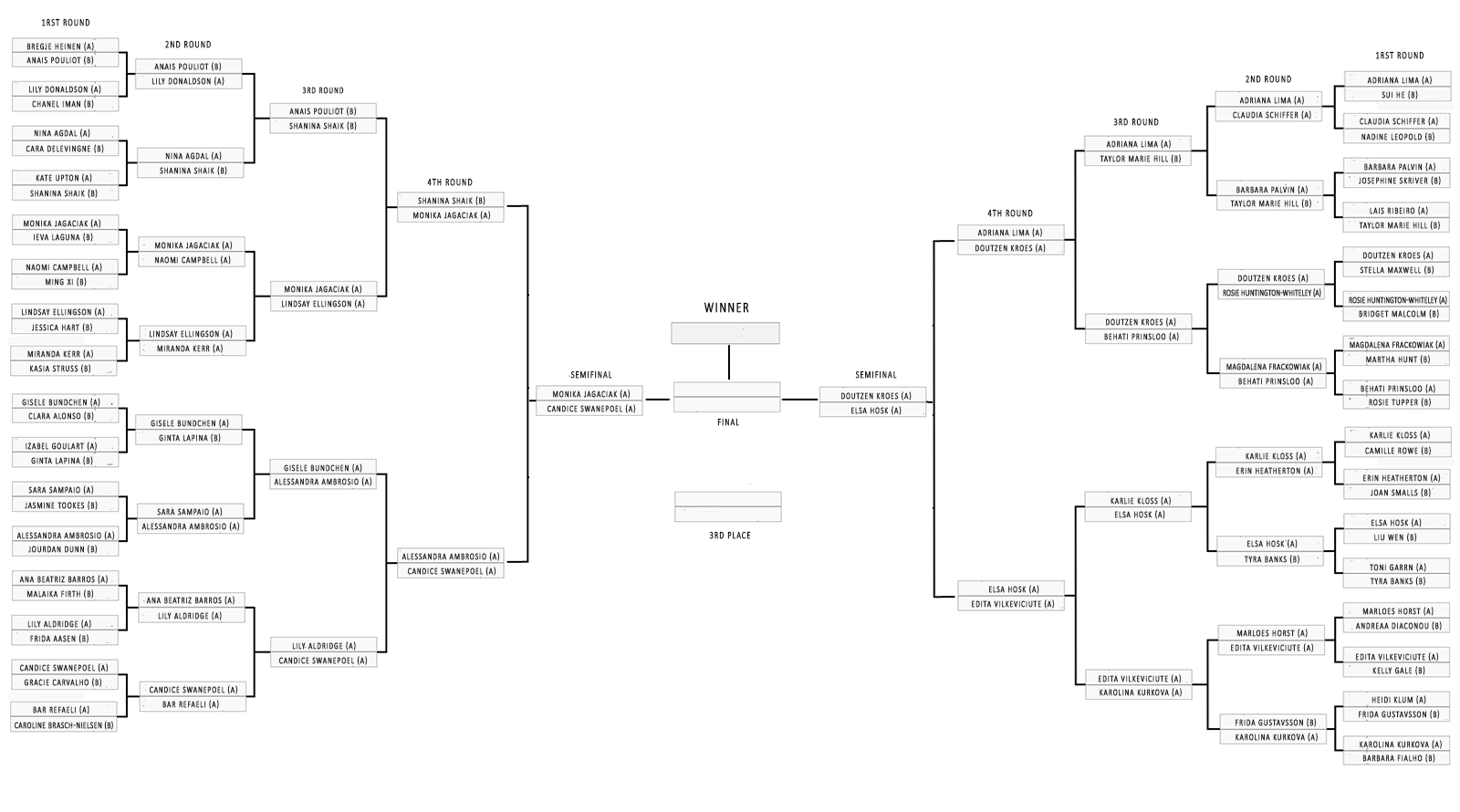 The models below will be randomly paired, so, in the first round a model from the group A and a model from group B will face each other. Thus, the winner of this match will face the winner of the second. This is the structure of the game: