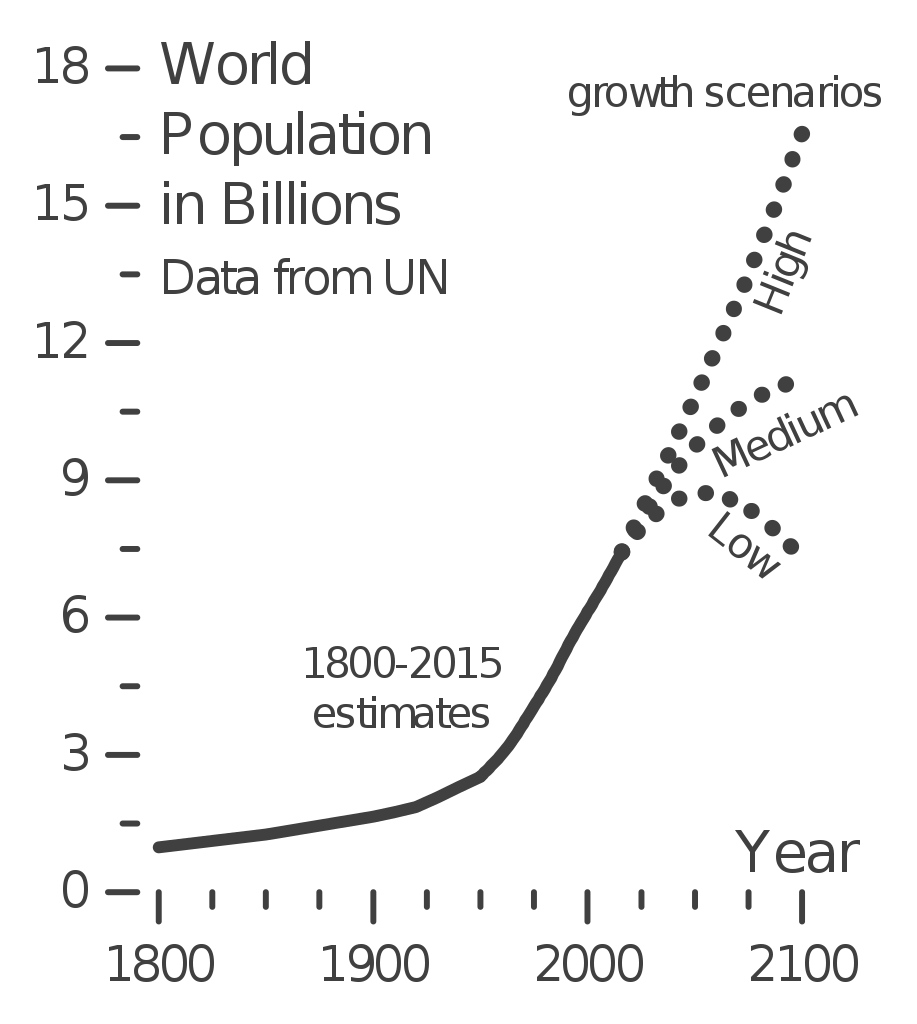 ^ To me, an amazing aspect of projections is the significant difference between the high and low numbers. Low projections usually mean one or more of these affect population growth: famine, disease, climate change, world war (among others).