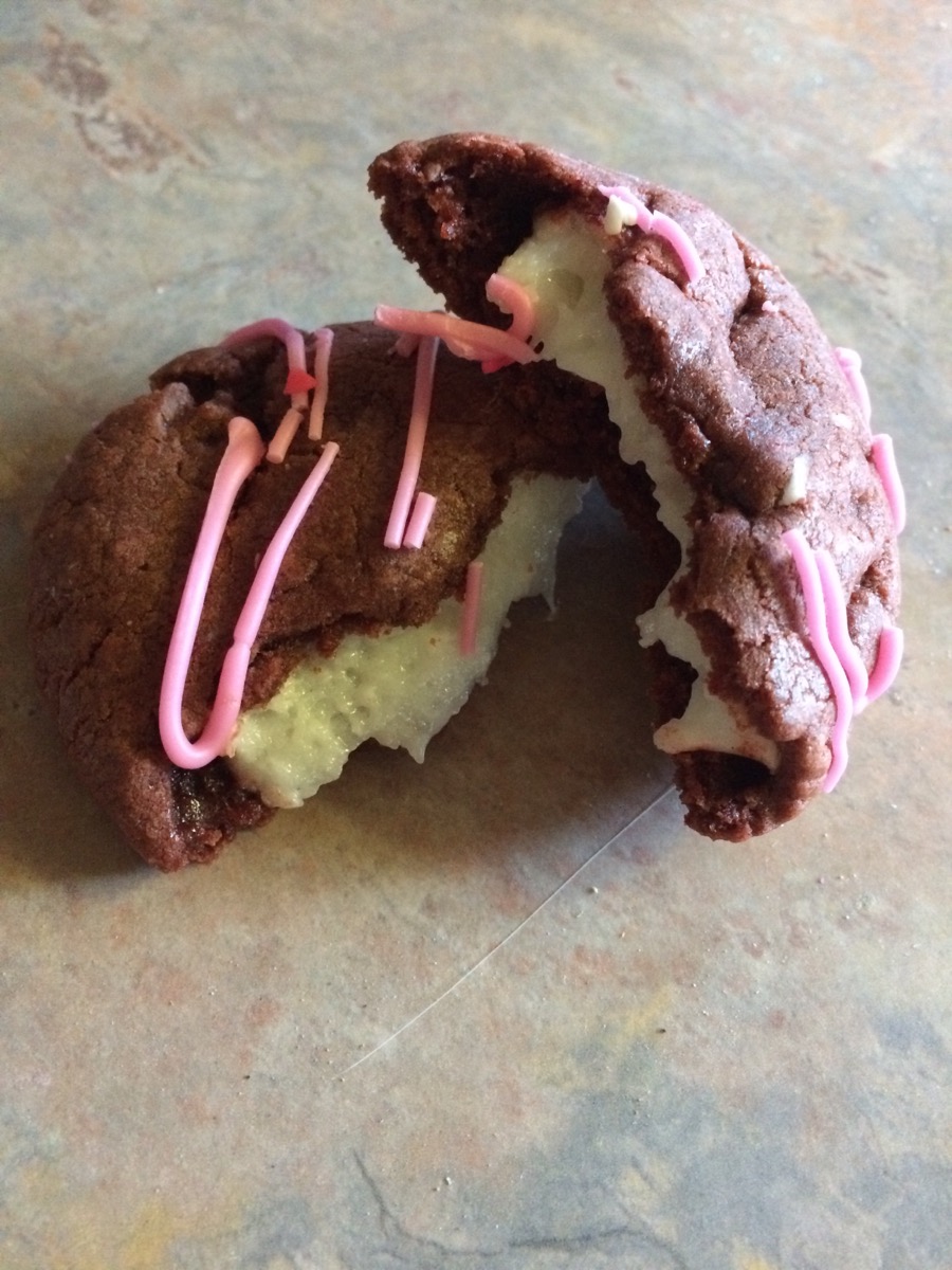 cause Pheno made me lovely Valentine's cookies. Red Velvet with cream cheese filling.
