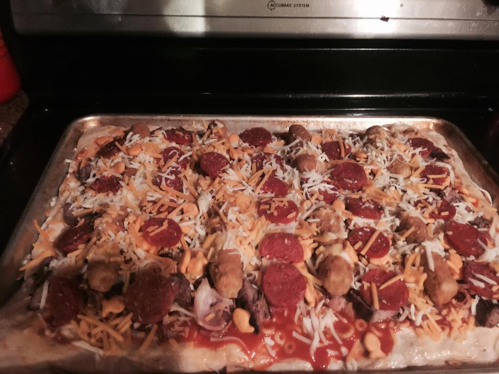 Sliced Steak 1 lb, Bacon 1 lb, Pillsbury Dough, Pepperoni, Mozzarella/Cheddar Cheese, Mozzarella Sticks (20 sticks), Hot Dogs (full package), Cinnamon Toast Crunch Cereal, Goldfish Crackers, Cheese Whiz and Chef Boyardee SpagphettiOs with Meatballs