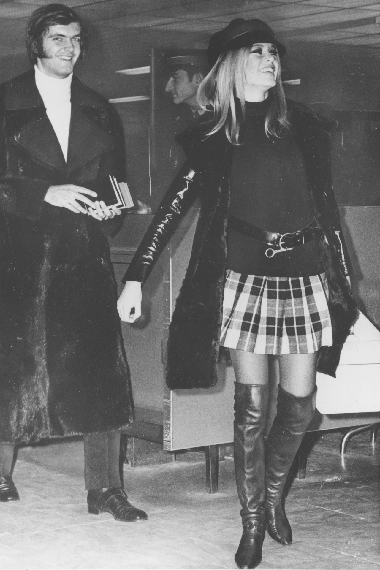 DECEMBER 1968 – Wearing a tartan mini to board a flight from Paris to London with then boyfriend Patrick Gilles, who was 10 years her junior. The couple got together following the breakdown of Bardot’s marriage to Gunter Sachs but they broke up in the winter of 1970, when Bardot took up with an Alsatian barman from Courchevel– who was also 10 years her junior.