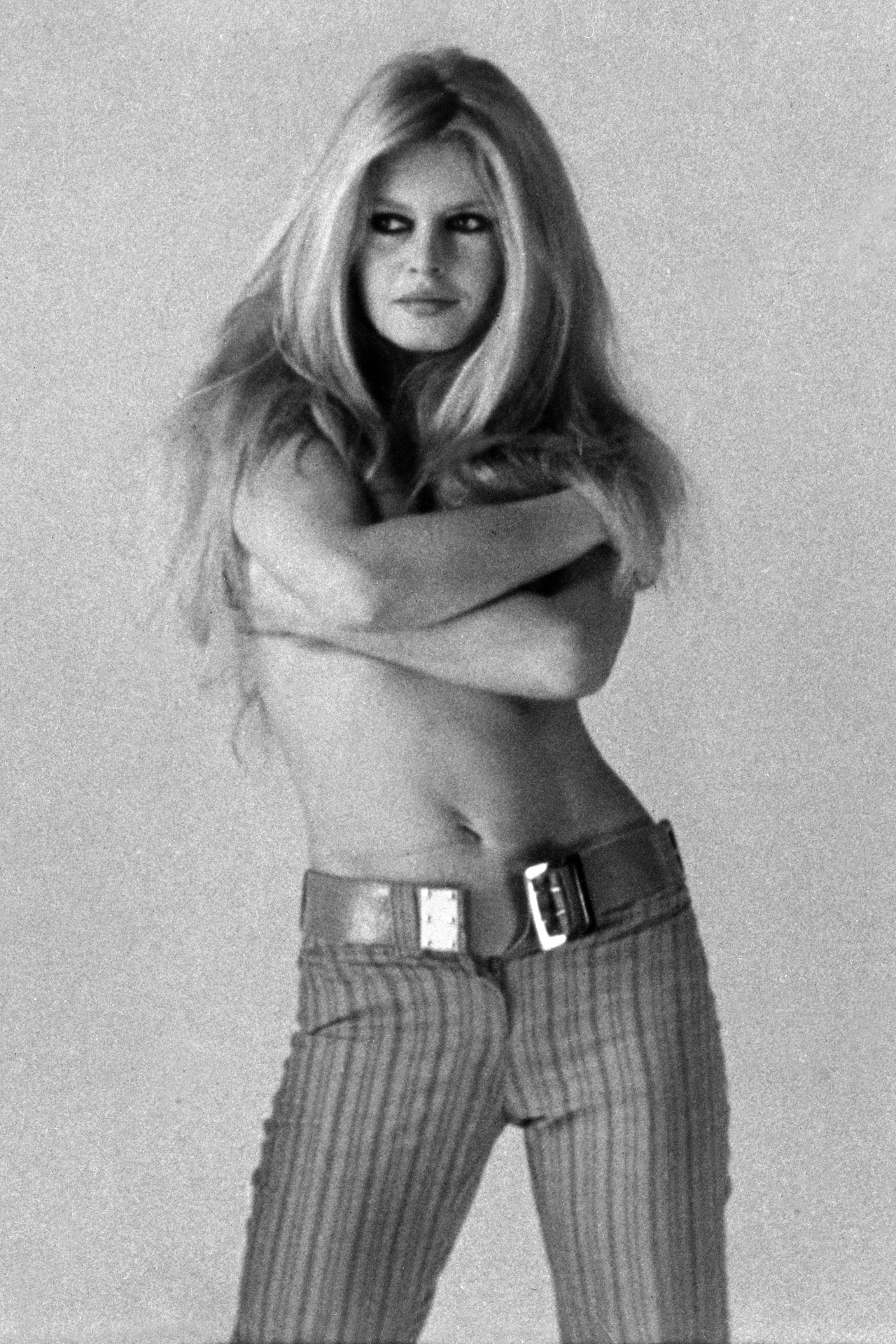 1968 – She posed for this provocative portrait wearing nothing but suggestively undone trousers and her signature smokey eyes.
