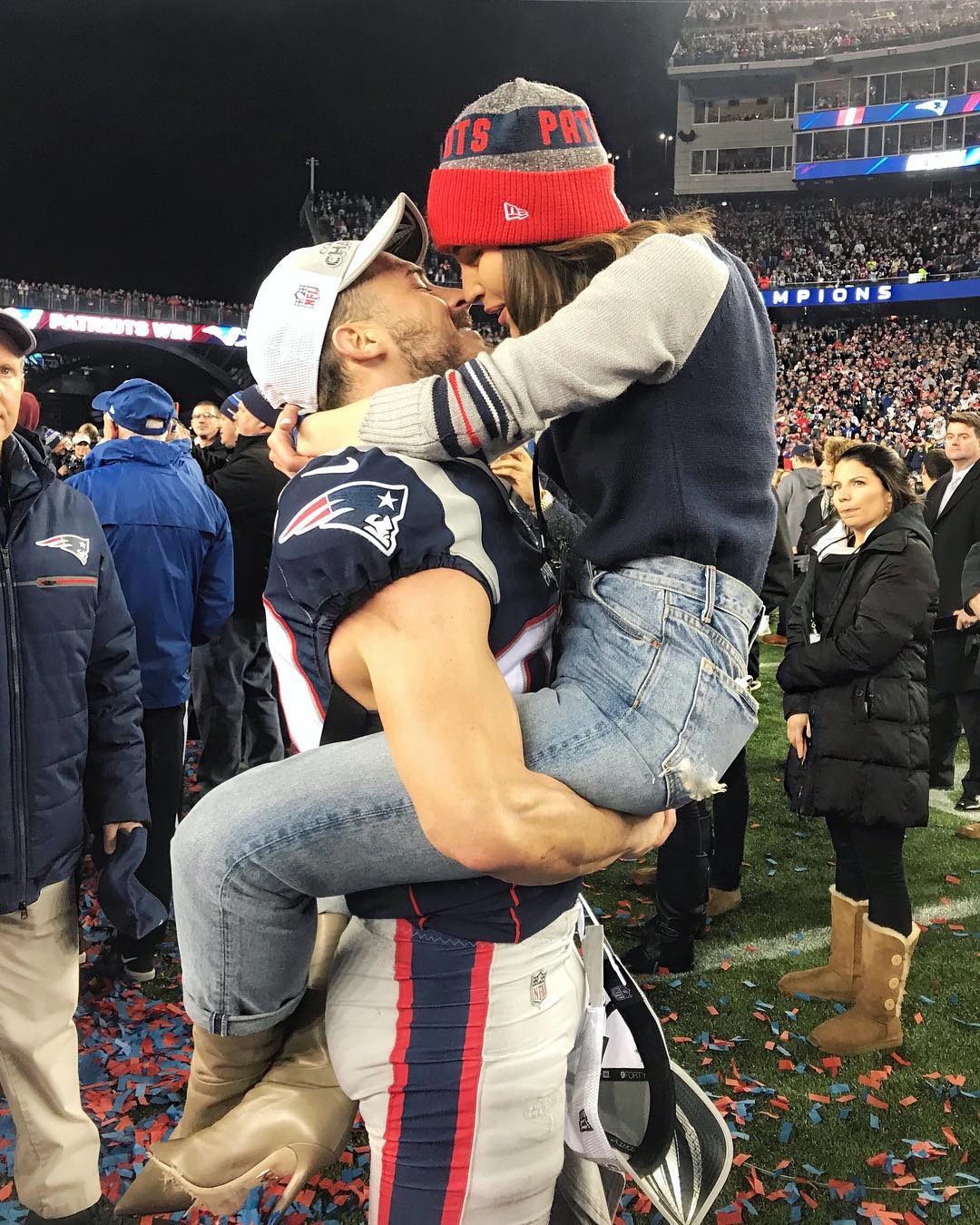 Following New England’s 24-20 win over Jacksonville in Sunday’s AFC Championship, the Patriots receiver embraced the brunette beauty on the field, as she wrapped her legs around his waist.