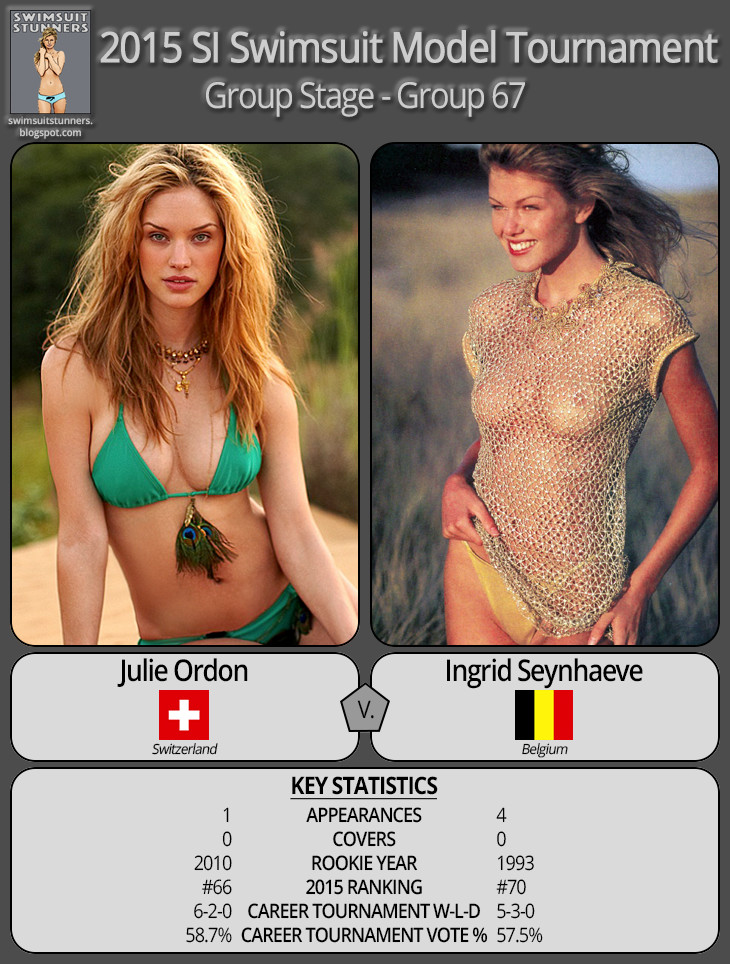 Lots of close matches today! Ingrid Seynhaeve, Samantha Hoopes, Carre Otis, and Michelle Vawer were all victors, but none of them got more than 52.5% of the vote! So, that means Julie Ordon, Kate Bock, Angela Lindvall, and Fernanda Tavares go home unhappy.