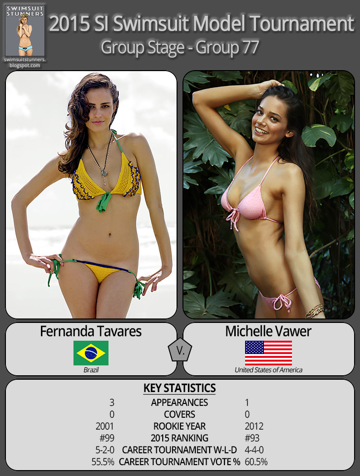 In Group 37, Daniella Sarahyba won the bodypaint battle against Jessica White rather easily. Daniella improved to 7-2-1 in her tournament career, and Jessica fell to a very lackluster 2-3-2 in her career. Two wins in seven career matches for someone with eight appearances in the SI Swimsuit issue!