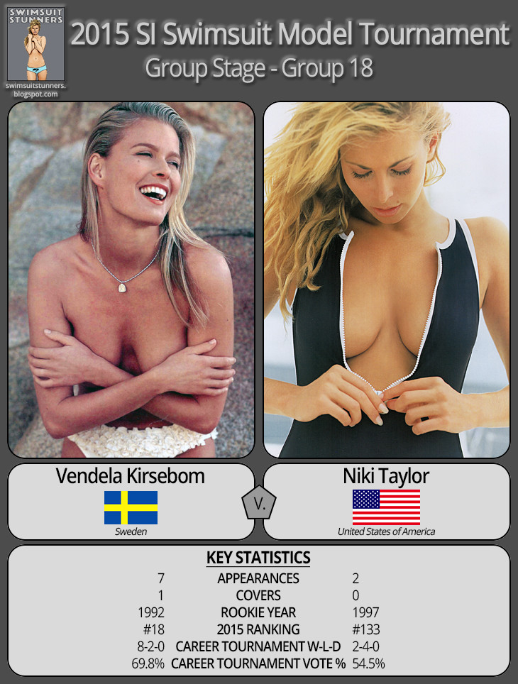 The big news of the day is the upset of #18 Vendela Kirsebom, who was toppled by supermodel Niki Taylor. Niki had struggled in past tournaments, but she also had tough draws. So, we knew she would probably give Vendela a tough match - or maybe even pull off an upset. I never predicted just how easy of a win she could have, though! Getting over 60% of the vote against the beautiful Vendela is an accomplishment. Perhaps more amazingly, Niki even beat Vendela in votes from Vendela’s native Sweden!