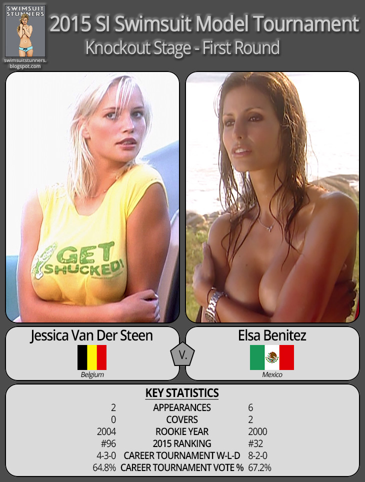 The biggest surprise of this first batch of matches was the beautiful Frenchwoman, Aurelie Claudel, dispatching of Lucia Dvorska very easily. Lucia had entered the match with a career record of 11-3, so Aurelie capturing more than 3/4 of the vote is very impressive. Aurelie moves on to setup a fascinating match against an SI legend, #9 Heidi Klum.