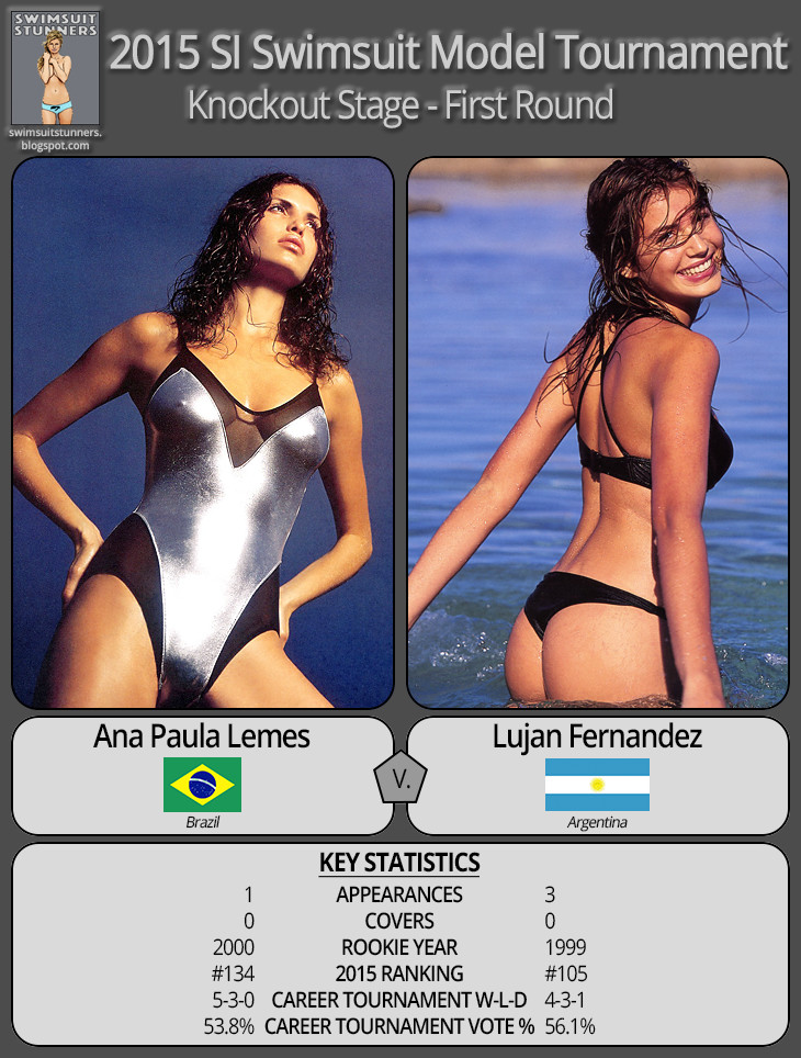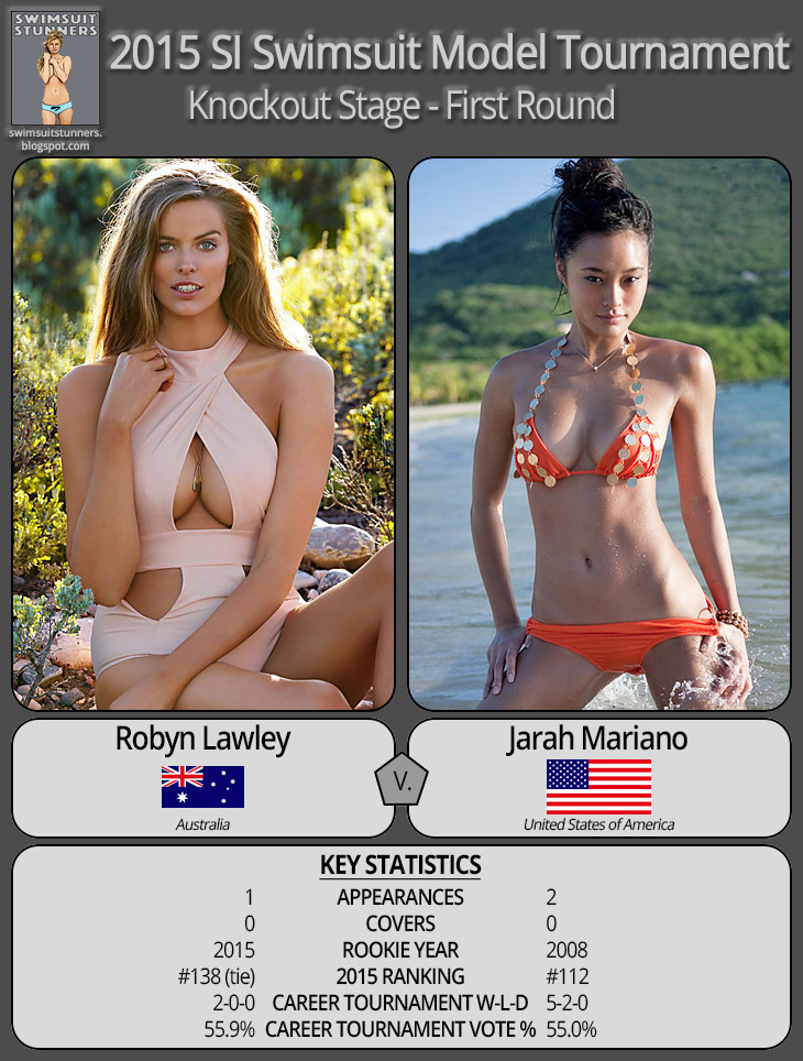 Lots to comment on in this “forgotten” batch of results. First, let me start by acknowledging the accomplishment of rookie Robyn Lawley, who dispatched of Czech supermodel Eva Herzigova in a close match and moved on to the Knockout Stage. Personally, I don’t find Robyn very attractive, and it has nothing to do with her “plus size” categorization. I think there are 150-200 SI models that I’d vote for before her. But, this competition is about you the voters, not me, and you voted Robyn! ![]()