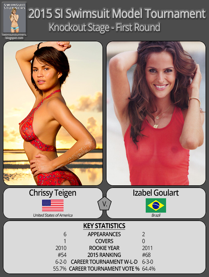 Next up for discussion: the polarizing Chrissy Teigen. Chrissy seems to have her lovers and her haters. But, there were enough lovers in the voting community to eek her past Hungarian model Reka Ebergenyi and into the Knockout Stage.
