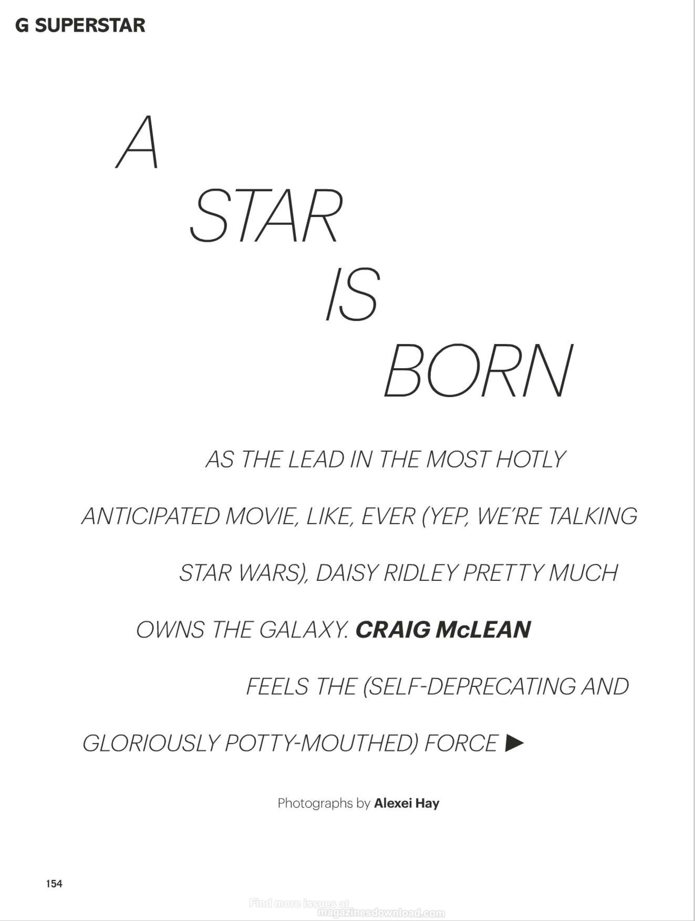 Daisy Jazz Isobel Ridley (born 10 April 1992) is an English actress. She is to appear in the lead role of Rey in the 2015 film Star Wars: The Force Awakens.