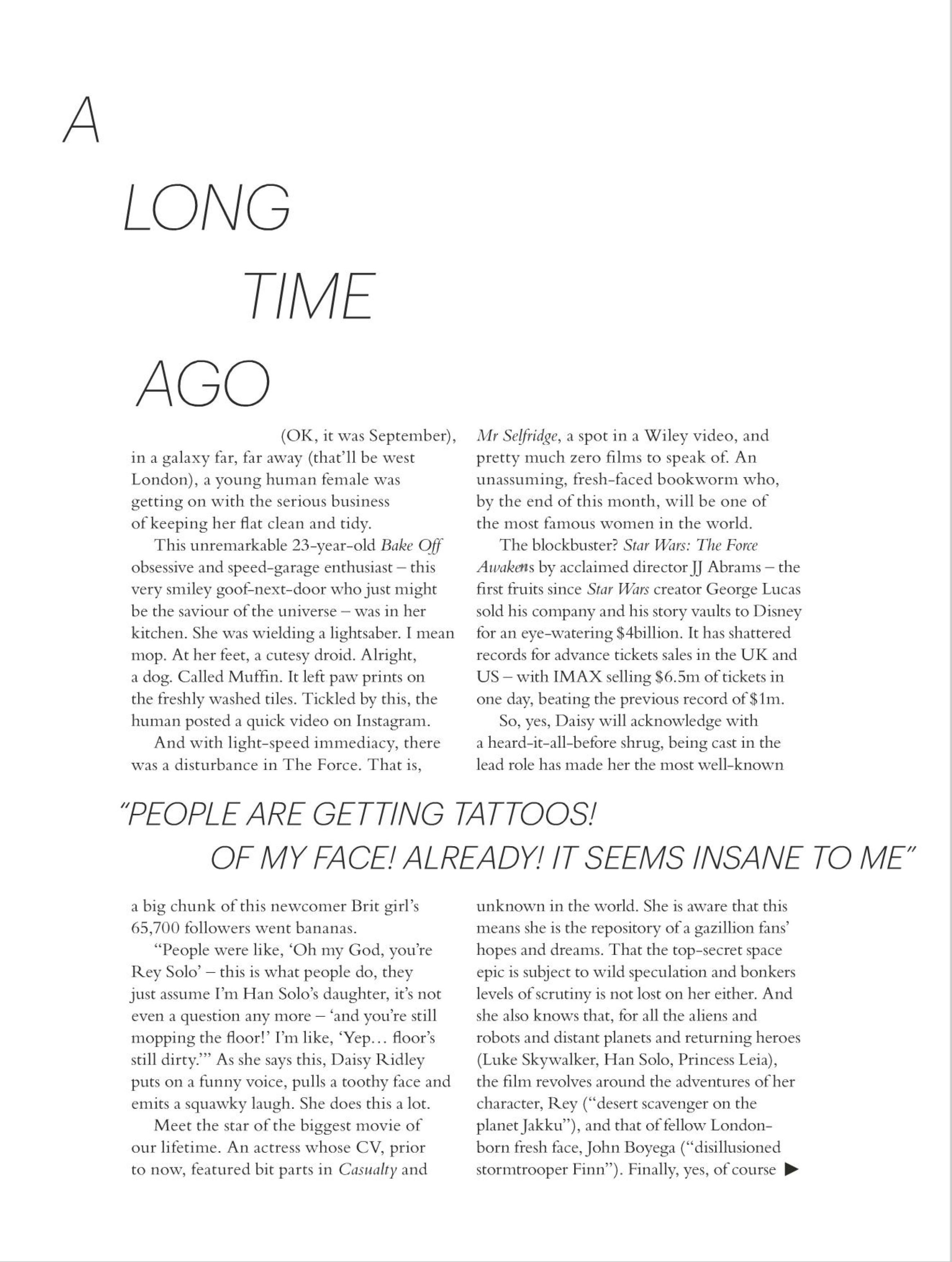 After receiving several competing offers, Ridley switched from her original talent agency Jonathan Arun to the United Talent Agency in August 2014. Following a two-month stint with UTA, Ridley signed on with the Creative Artists Agency in October 2014. In August 2015, it was announced that Ridley would voice the lead role of Taeko in the English dub of the 1991 animated film Only Yesterday, scheduled to be released in 2016.