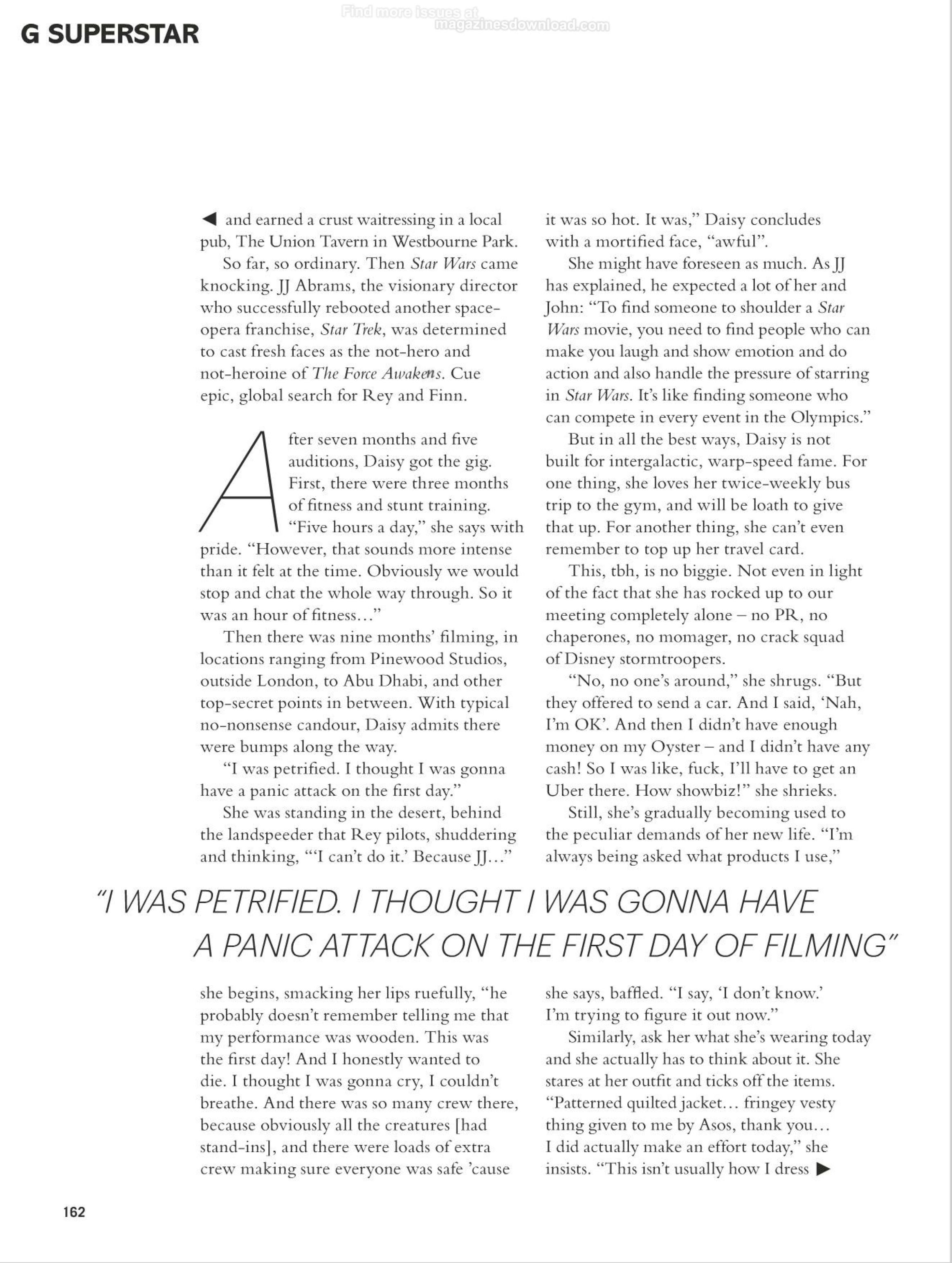 In April 2014, it was announced that she will play Rey, one of the lead characters in Star Wars: The Force Awakens. She was chosen for the film in February 2014. The casting of Ridley has generally been seen as a move by director JJ Abrams to repeat the casting of relatively unknown actors for the lead roles as George Lucas did with the first Star Wars film in 1977.
