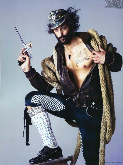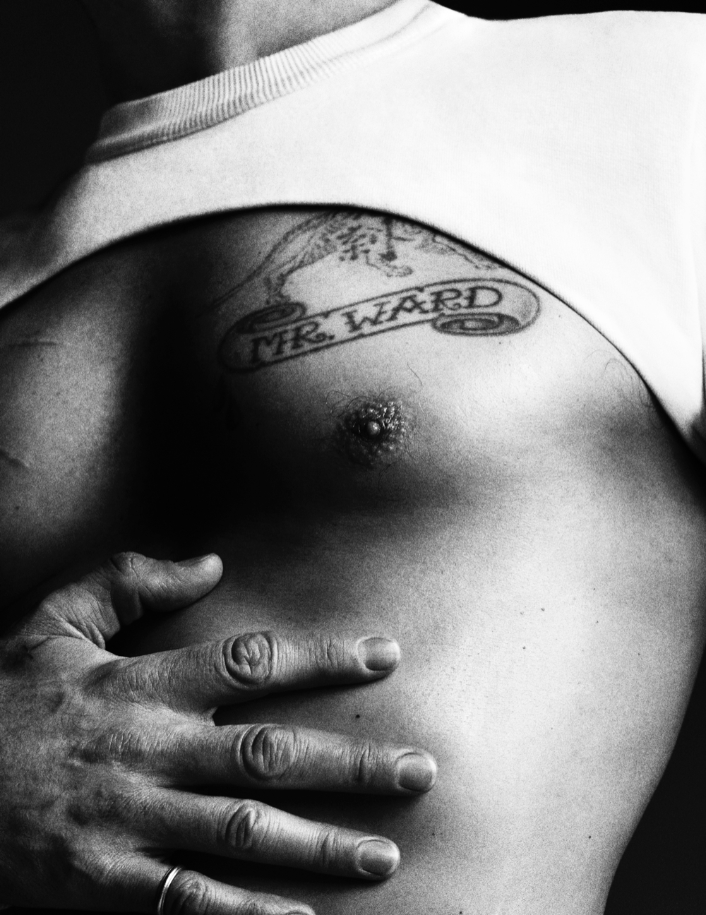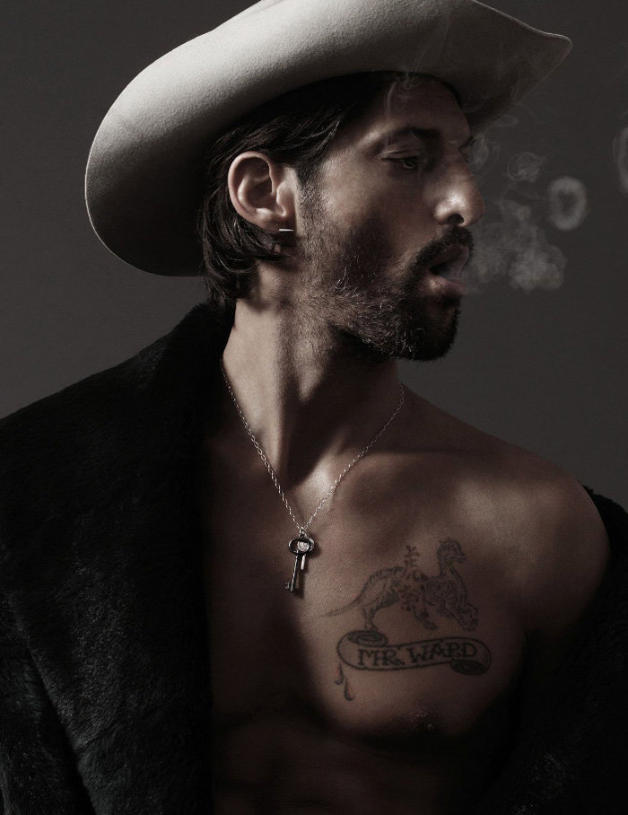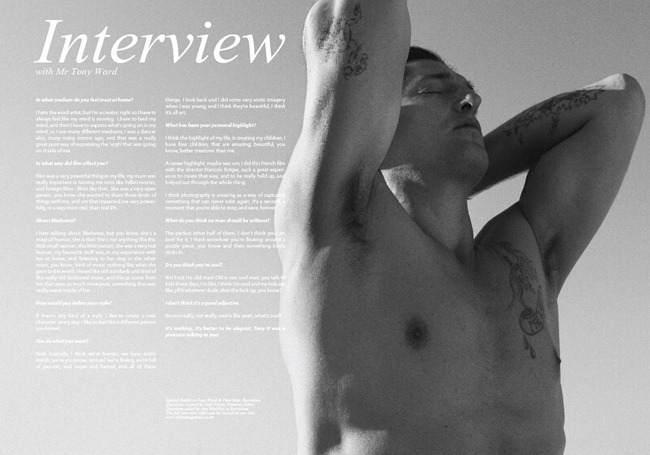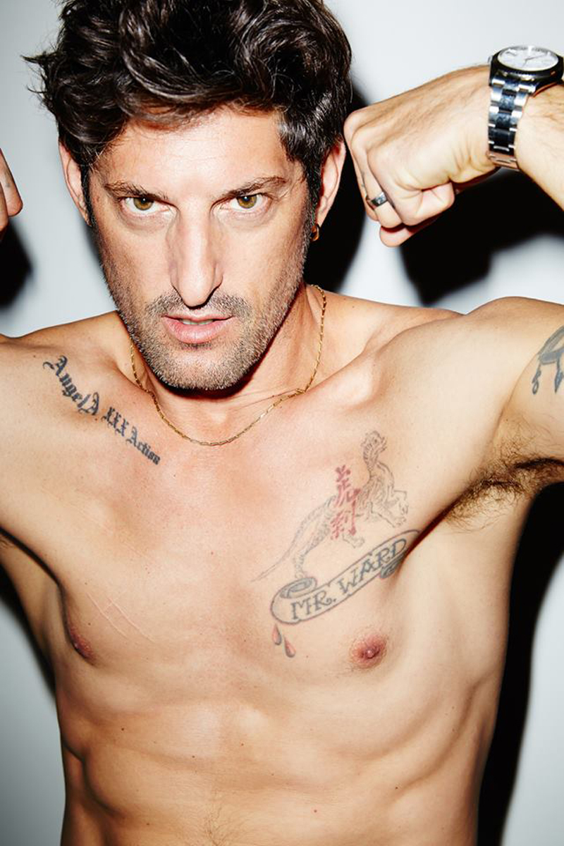 Mr. Ward is nothing short of a 20th Century renaissance man, dabbling his feet in everything from modeling and photography to acting and writing. Making his debut in the 80's, appearing in Calvin Klein's underwear campaign shot by Herb Ritts, Tony then achieved notoriety in the early 90's for dating Madonna, appearing in her Justify My Love video and her controversial "Sex" book. Tony has since then embraced the titles of father, husband, top model, actor, artist, photographer, designer, painter, writer, producer, and director. With a never ending and quite impressive resume, Ward has worked alongside with photographers like Karl Lagerfeld, Steven Klein, Steven Meisel and Terry Richardson and for fashion designers such as Roberto Cavalli, Chanel, Dolce & Gabbana, Diesel, Fendi, H & M and Hugo Boss. He landed his first starring role in 1996 in the movie Hustler White. Ward has his own fashion brand SixInTheFace "Hand Ravaged Clothing by Mr.Ward". All we can say is, 22 tattoos on one man never looked so good.