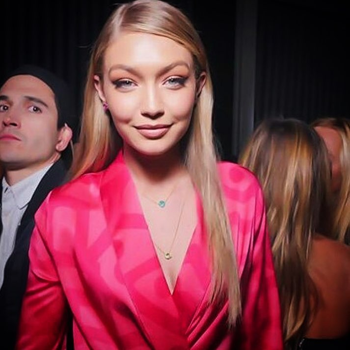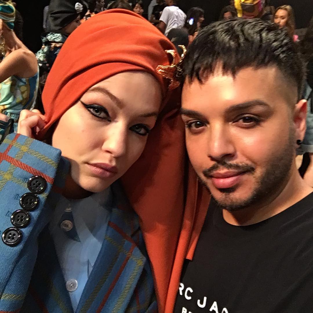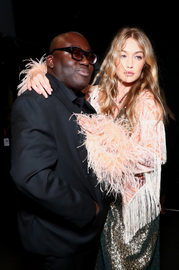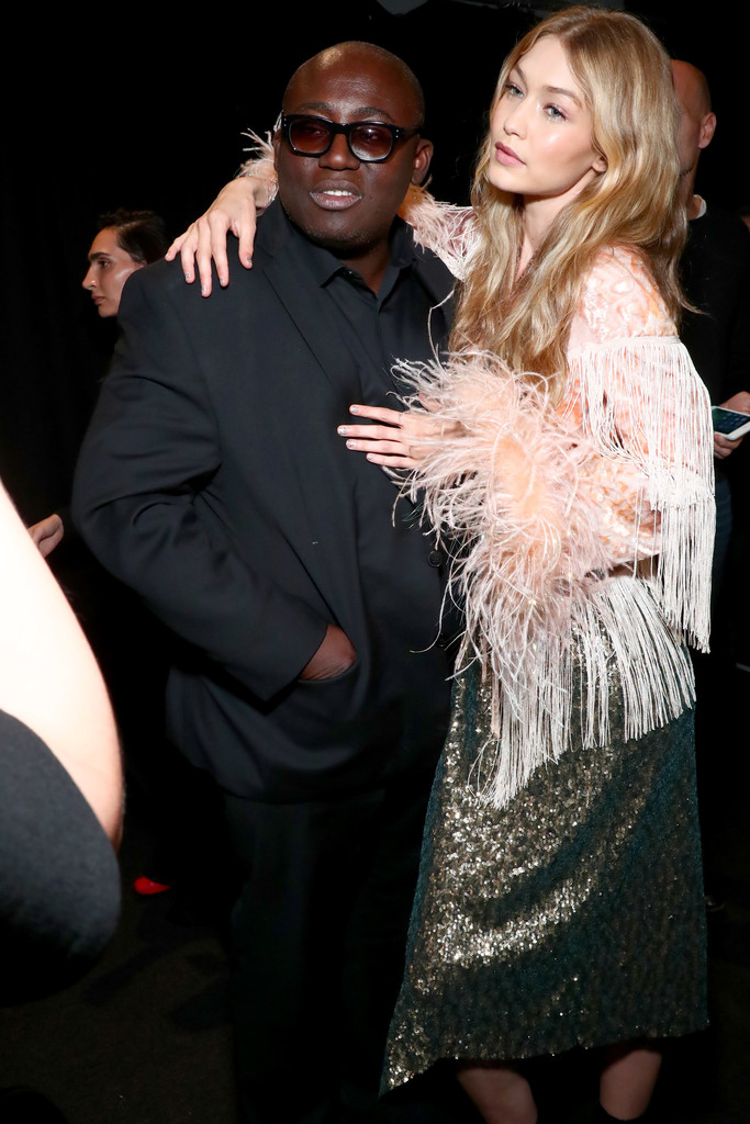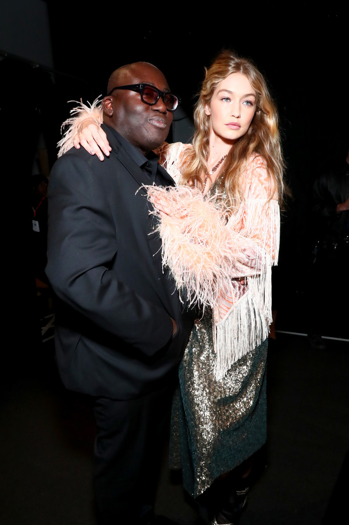 Edward Enninful and Gigi Hadid pose backstage for Anna Sui fashion show during New York Fashion Week: The Shows at Gallery 1, Skylight Clarkson Sq on September 11, 2017 in New York City.