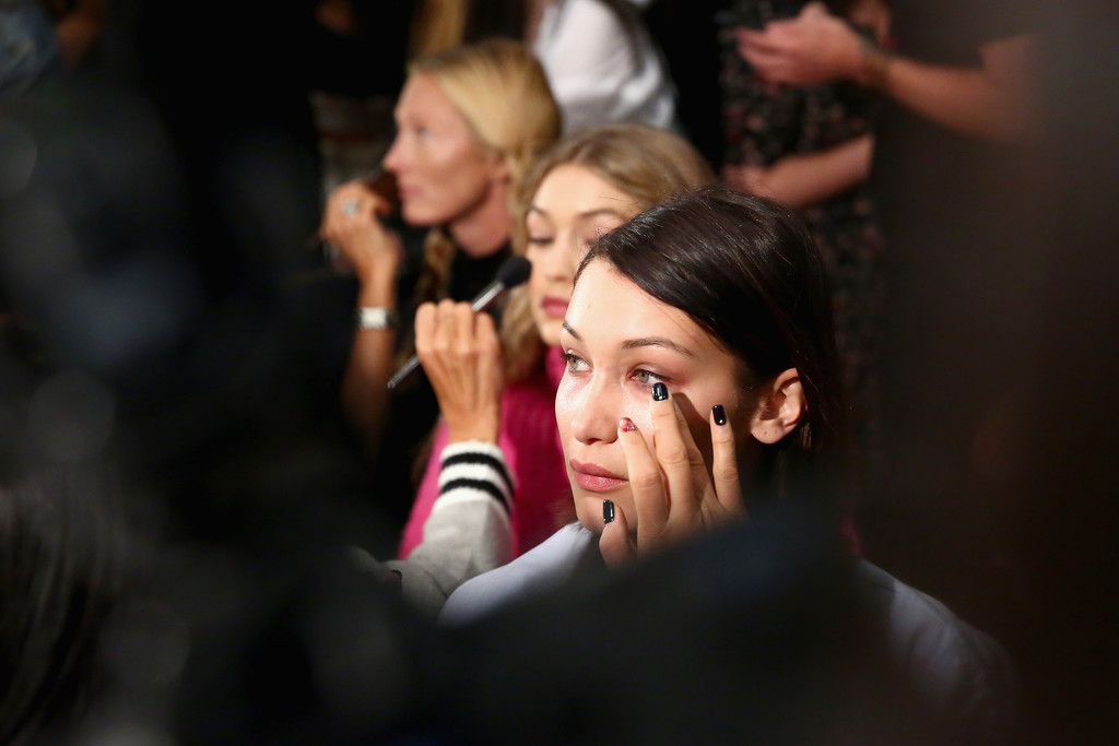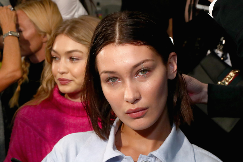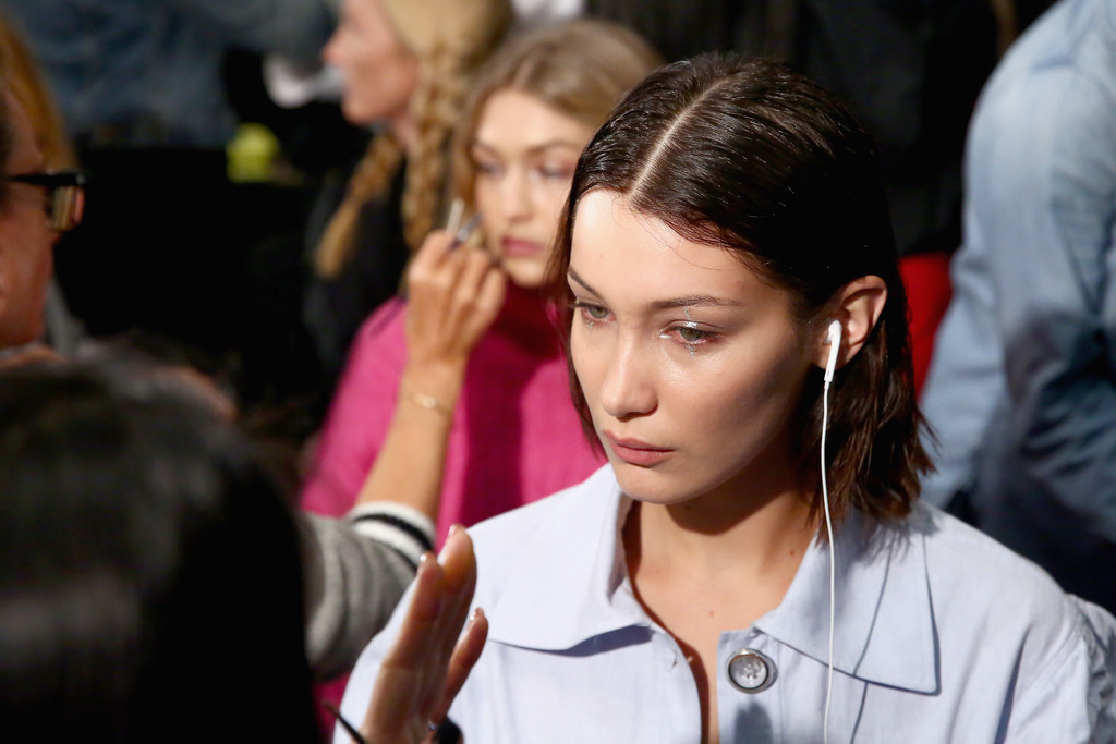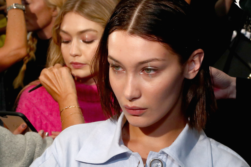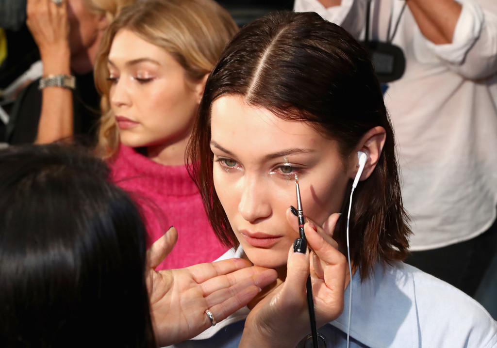 Models Bella Hadid (L) and Gigi Hadid prepare backstage for Anna Sui fashion show during New York Fashion Week: The Shows at Gallery 1, Skylight Clarkson Sq on September 11, 2017 in New York City.