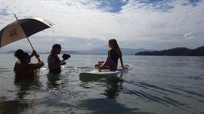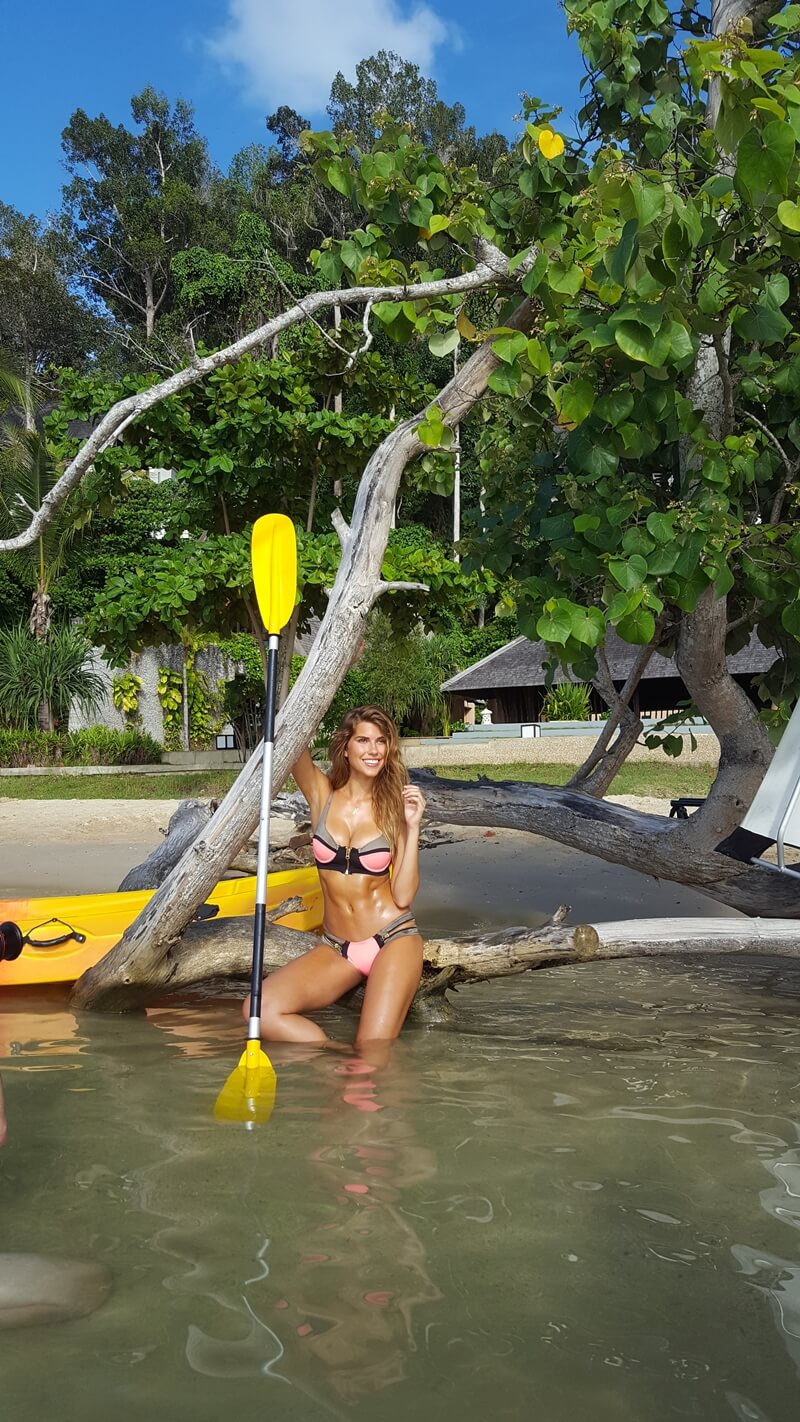 The shoot started on the beach in front of the resort, gradually edging towards the water and the resort's water sports gear. Soon enough, Kara was on a SUP board, drifting out into the blue beyond. The crew also dabbled in the sport, but only Tropical Bro managed not to embarrass himself.