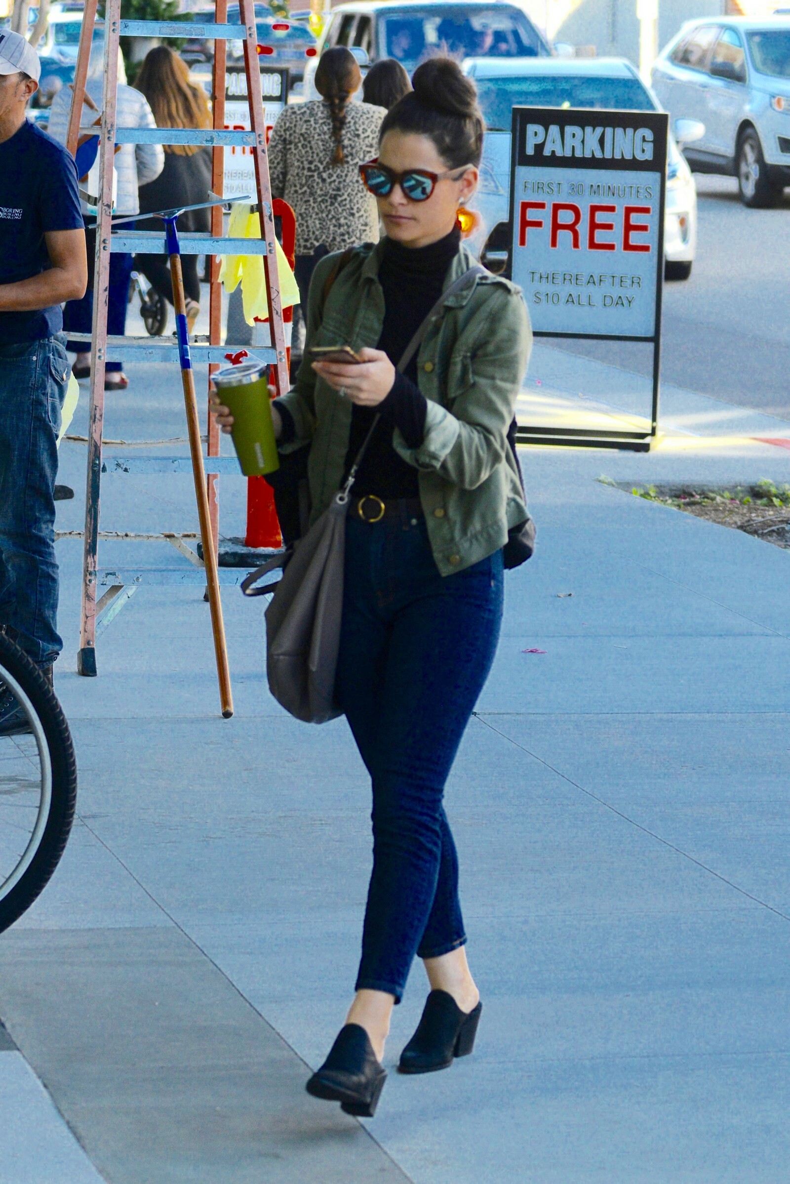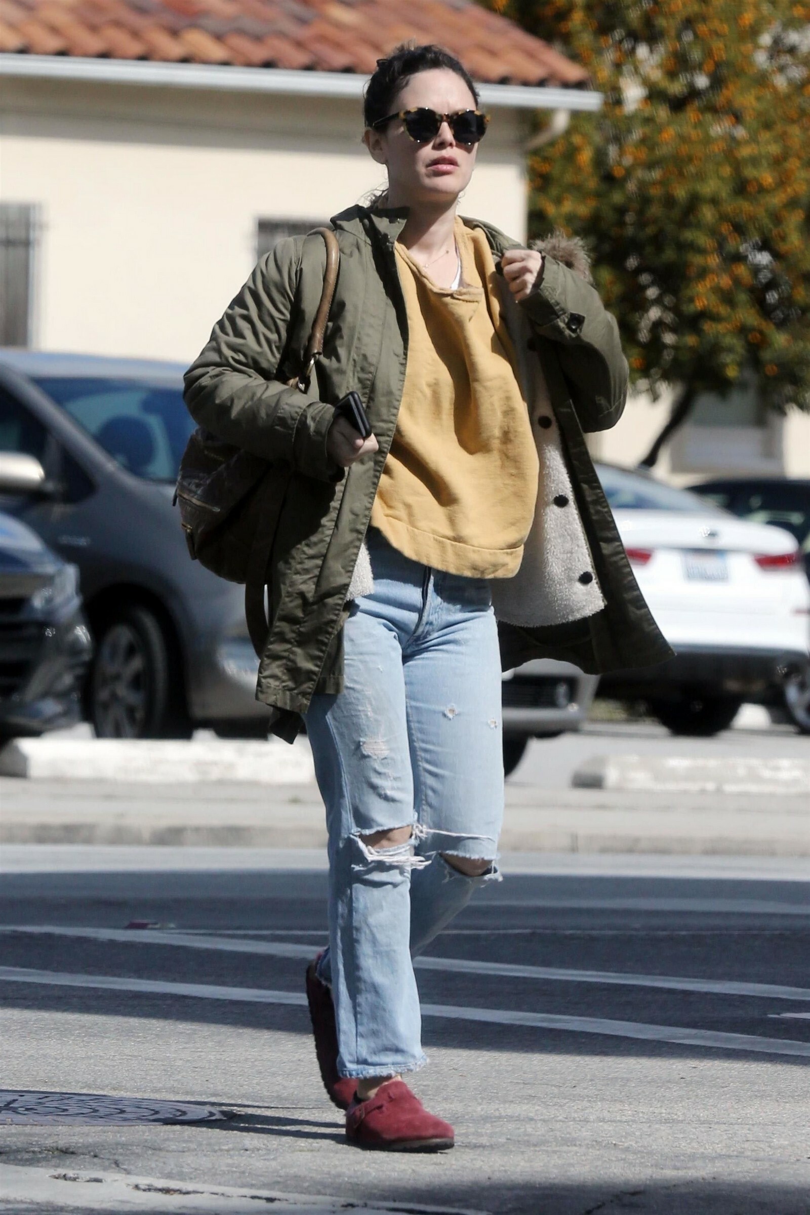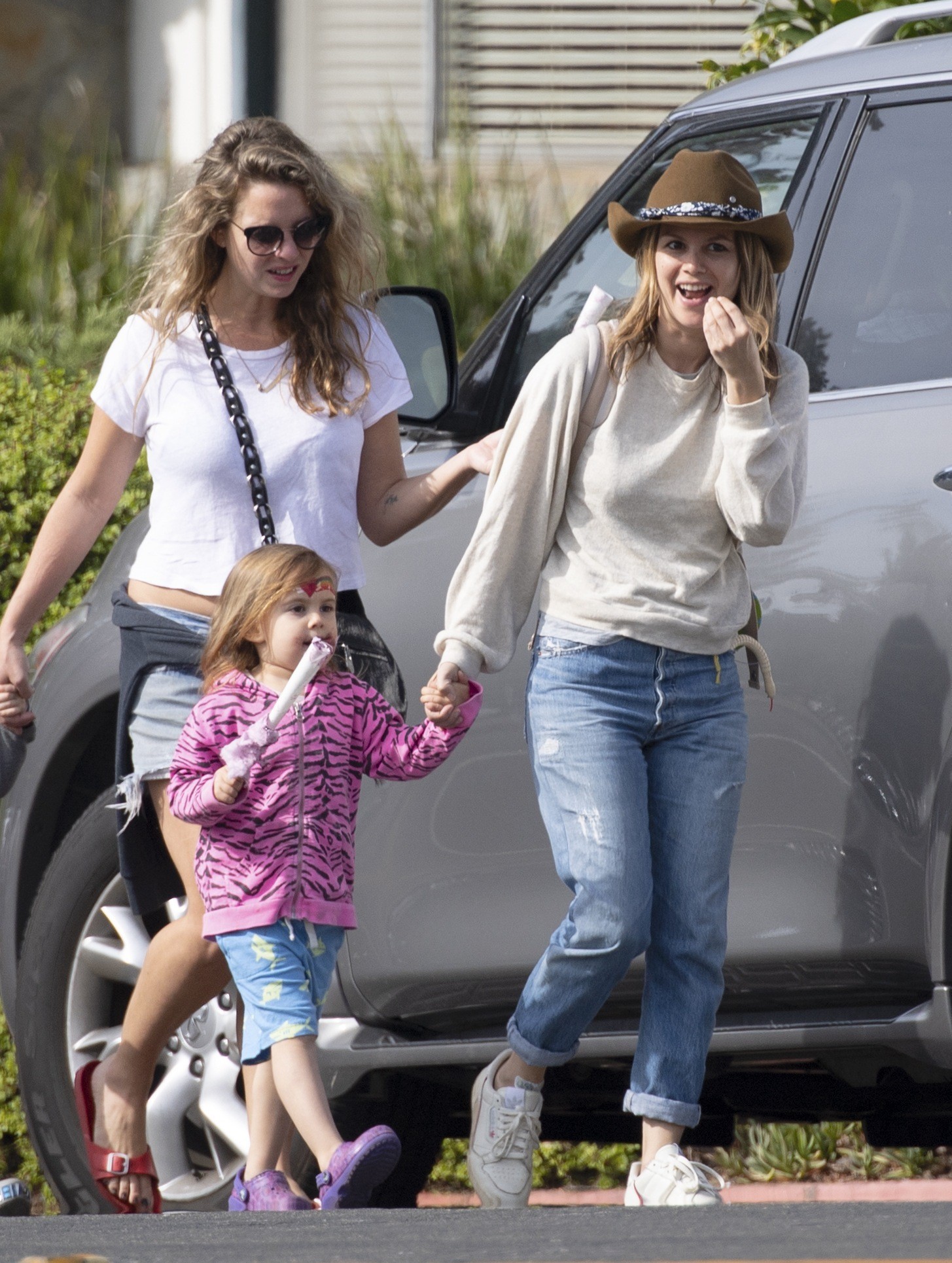 wearing an Ulla Johnson blouse, an Alice McCall leather dress, and Chloe Gosselin shoes