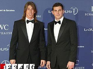 Real Madrid's soccer players Iker Casillas and Sergio Ramos pose as their arrive for the Laureus World Awards ceremony in Barcelona April 2, 2007.