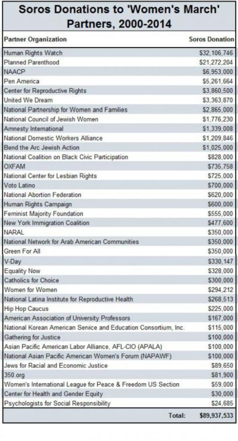 By my draft research, which I’m opening up for crowd-sourcing on GoogleDocs, Soros has funded, or has close relationships with, at least 56 of the march’s “partners,” including “key partners” Planned Parenthood, which opposes Trump’s anti-abortion policy, and the National Resource Defense Council, which opposes Trump’s environmental policies. The other Soros ties with “Women’s March” organizations include the partisan MoveOn.org (which was fiercely pro-Clinton), the National Action Network (which has a former executive director lauded by Obama senior advisor Valerie Jarrett as “a leader of tomorrow” as a march co-chair and another official as “the head of logistics”). Other Soros grantees who are “partners” in the march are the American Civil Liberties Union, Center for Constitutional Rights, Amnesty International and Human Rights Watch. ...