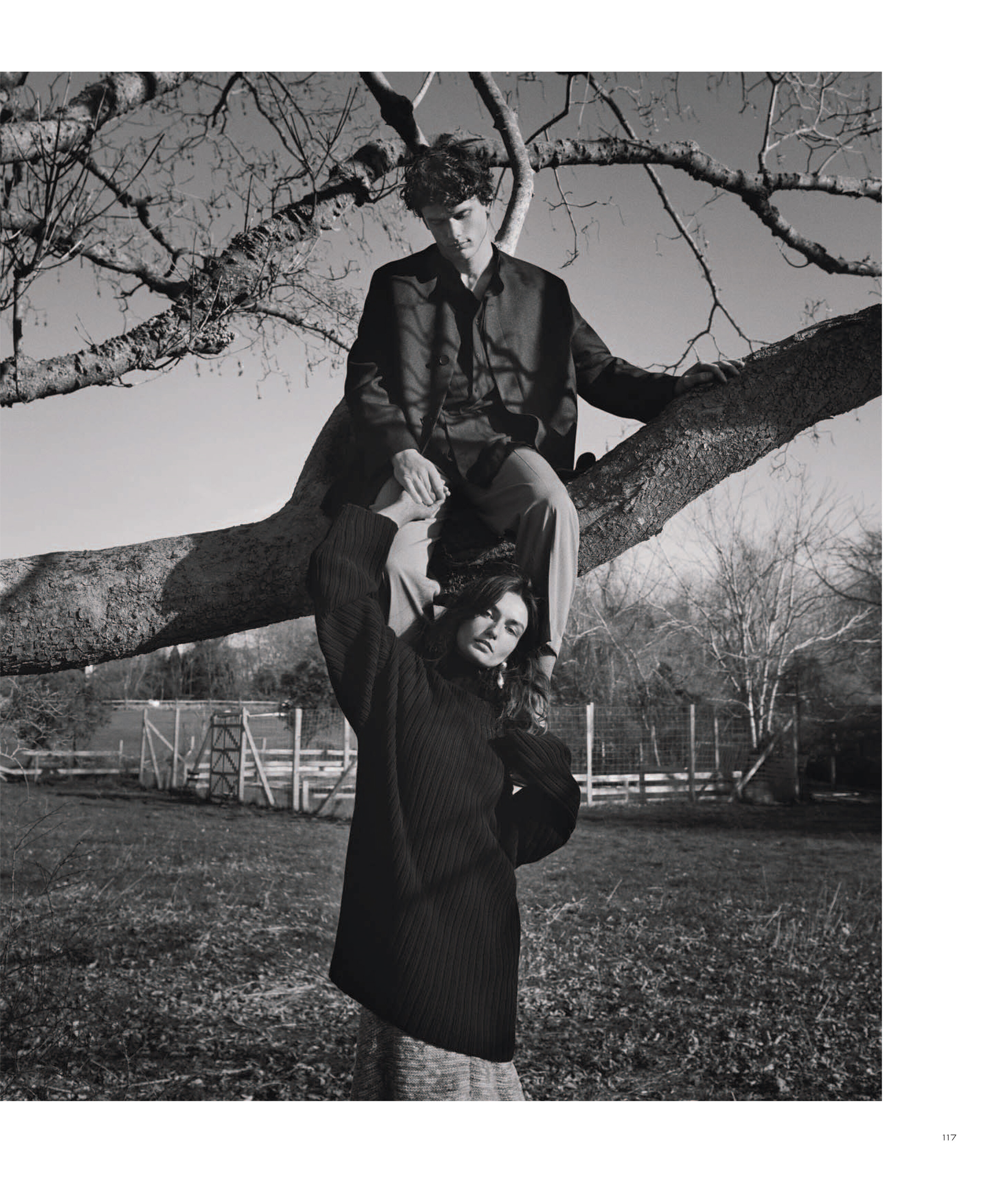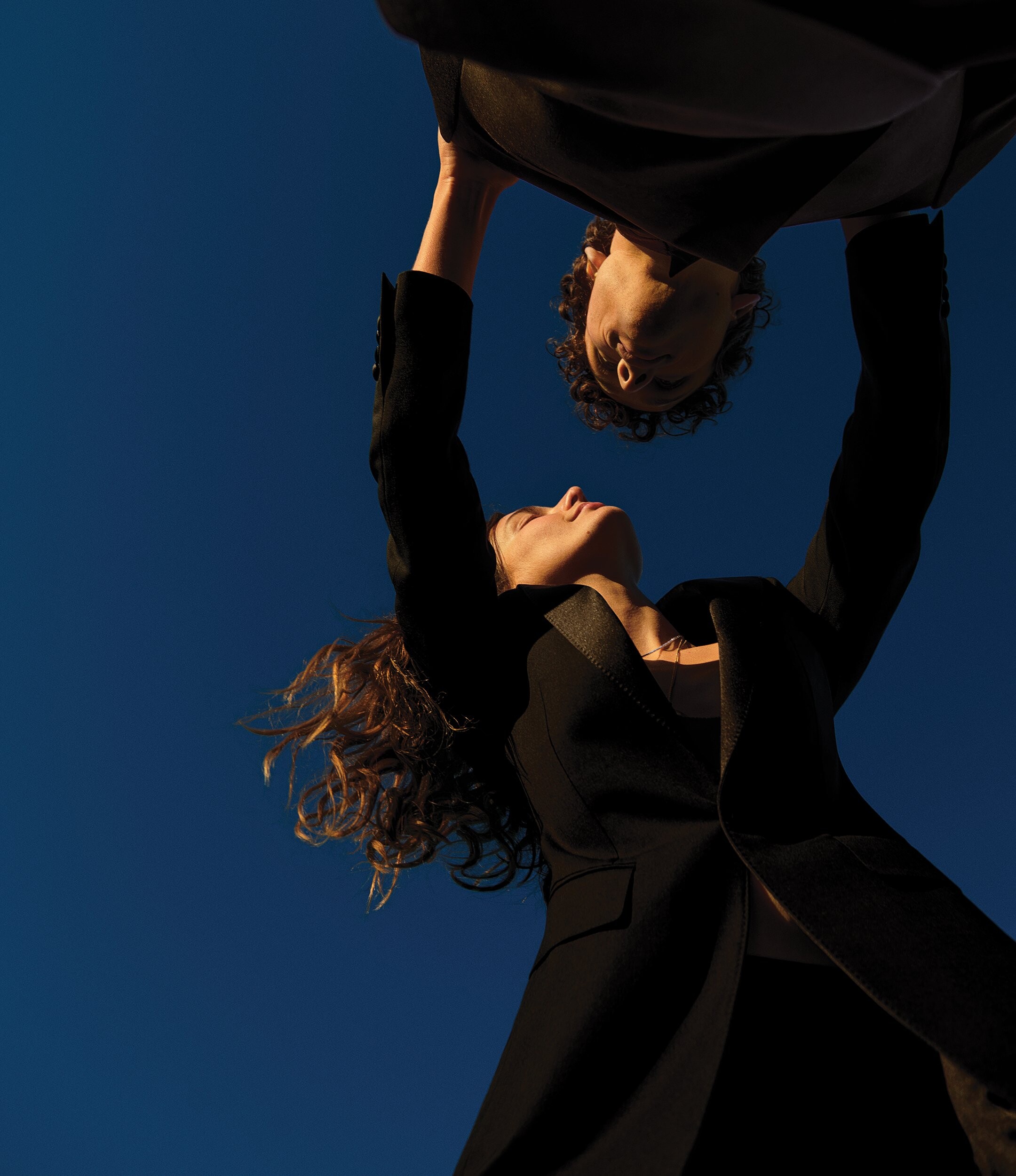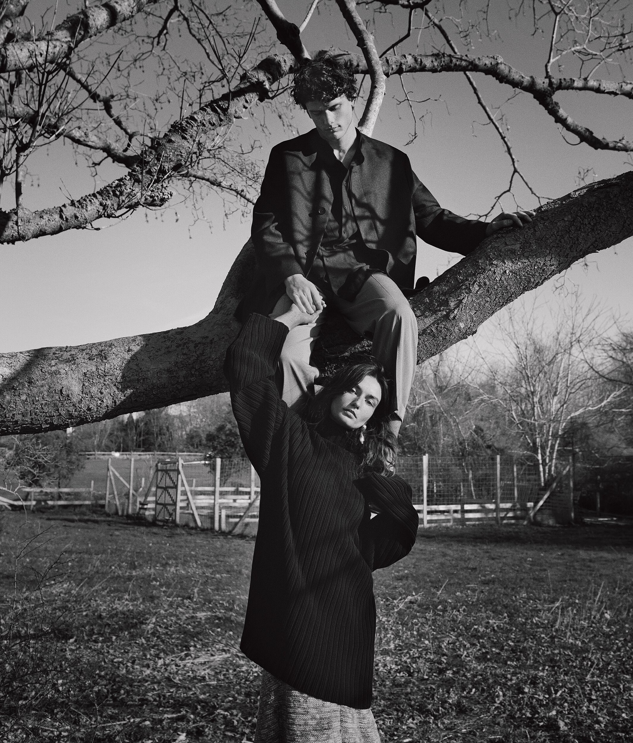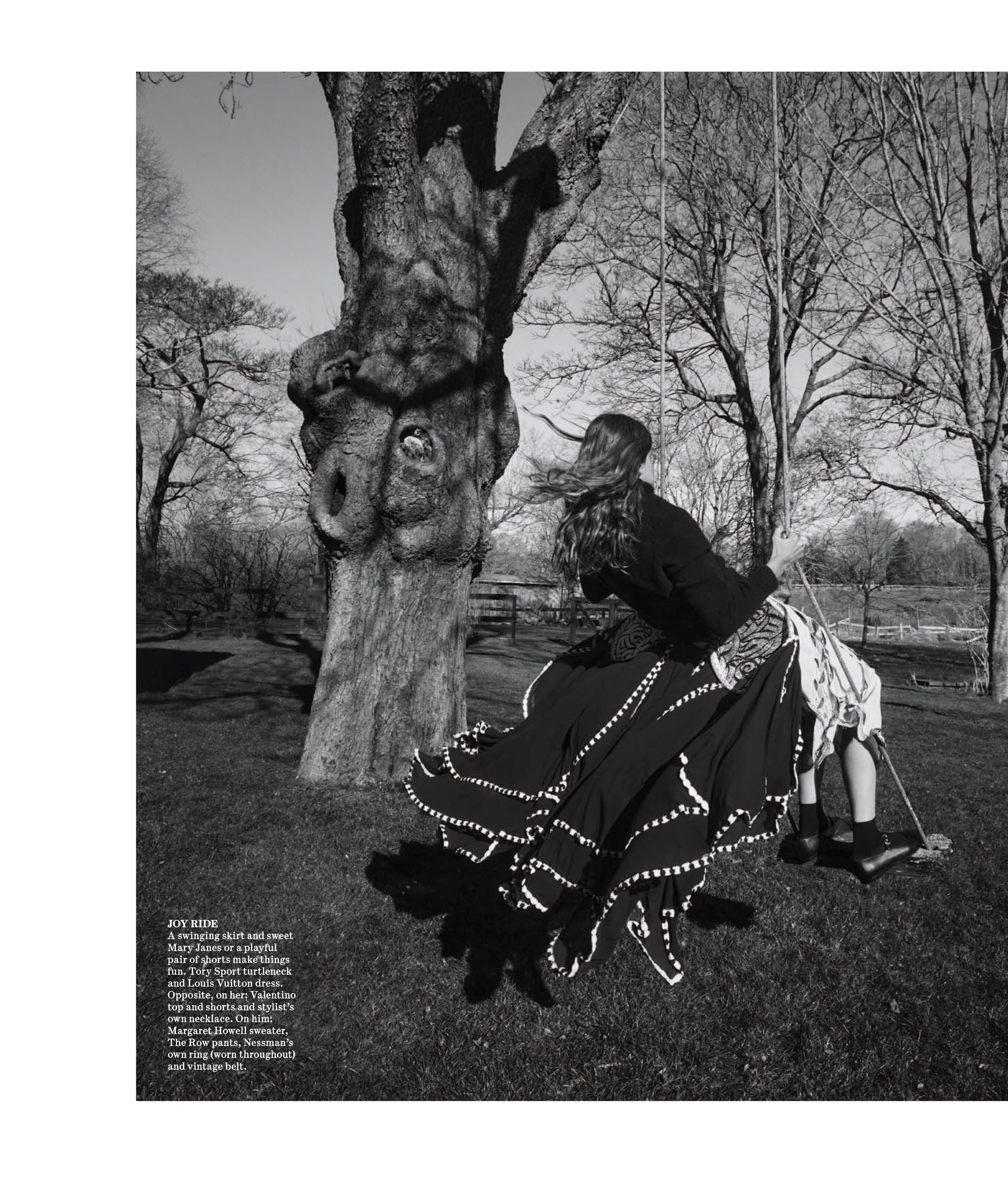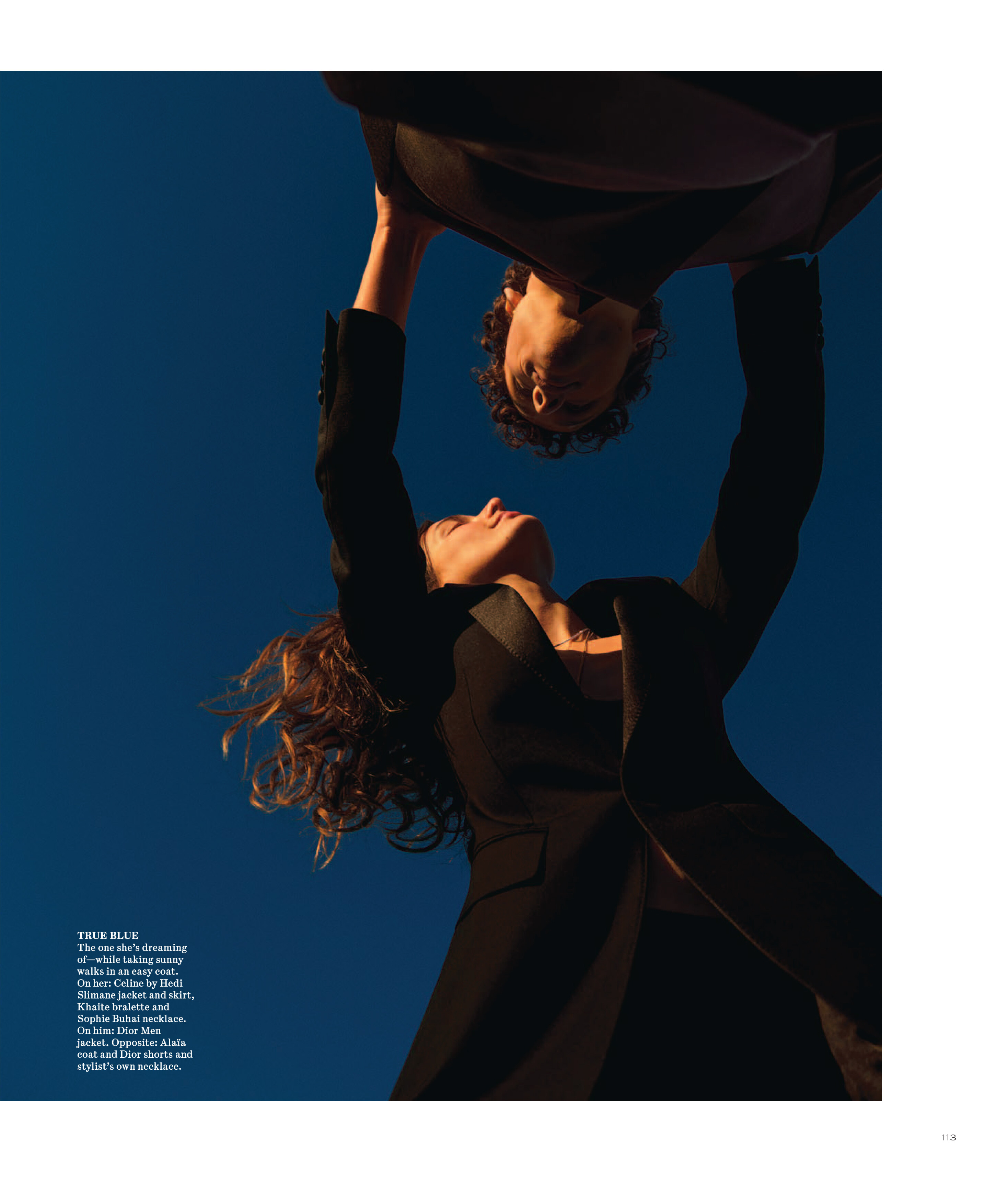 In this photo shoot, the duo’s relaxed attitudes shine through the clothing’s casual canvas. Stylist Katelyn Gray dressed the pair in dark colors, tailored suits and oversize sweaters from Prada, Louis Vuitton, The Row and Celine by Hedi Slimane, among others. “I have been wearing the same jeans and two sweaters for about three years now, so I would say I definitely [stepped] into a more polished character,” says Diaconu. —Natalia Barr