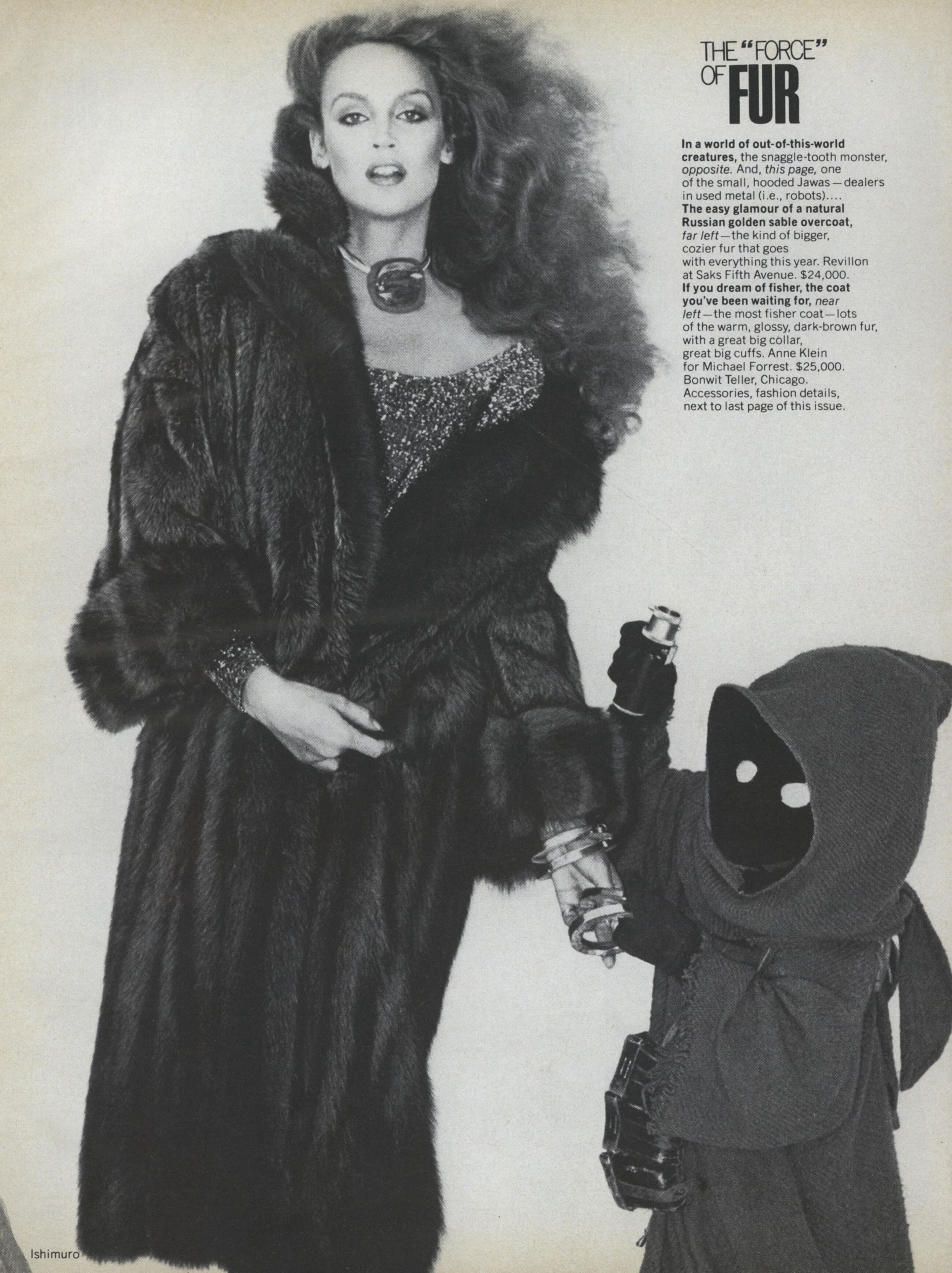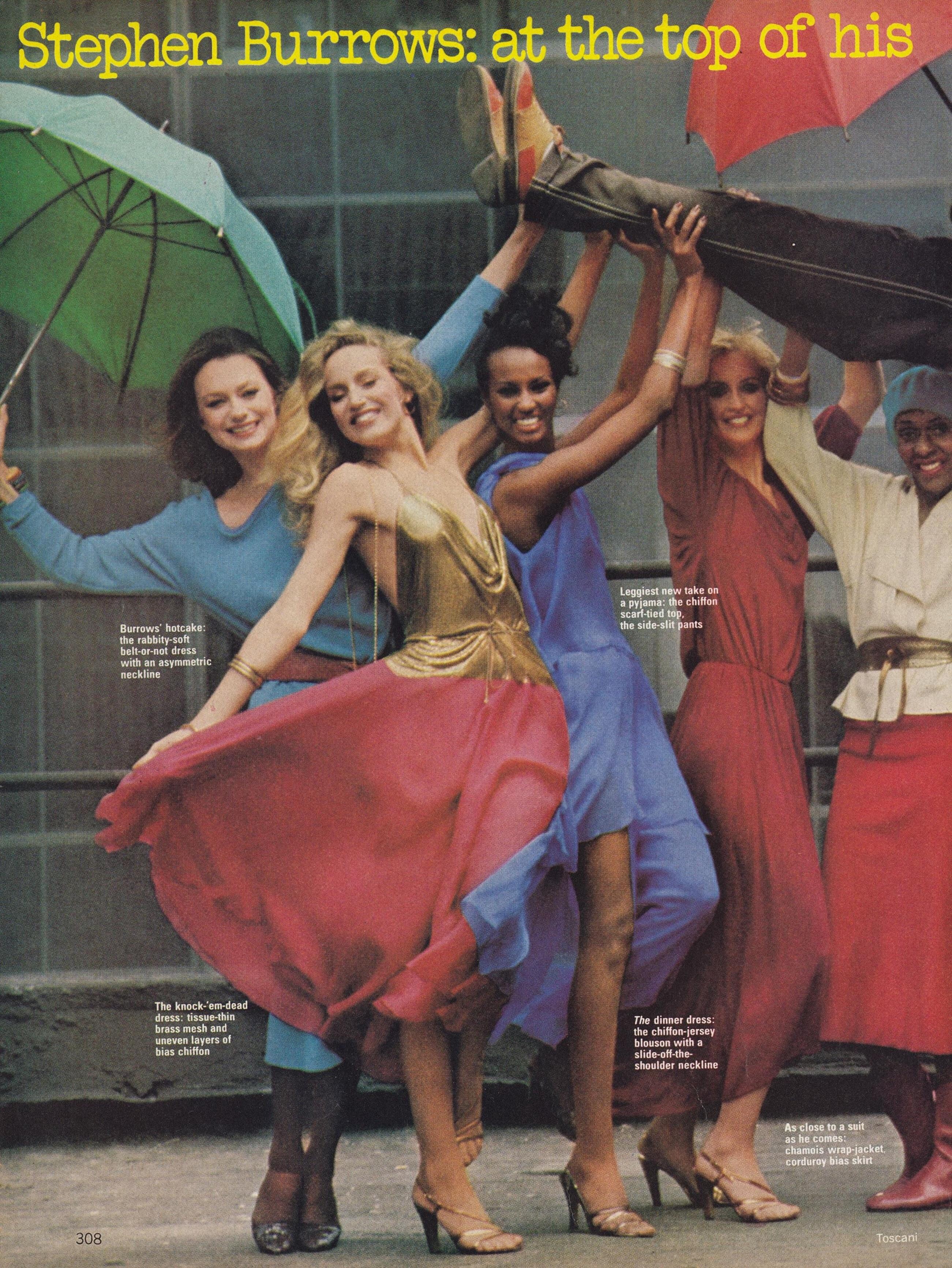 Models & Designers: Kathy Quirk, Kirsti Toscani, Lena Kansbod, Sara Kapp, Vibeke Knudsen, Jerry Hall, Iman Abdulmajid, Chris Royer, Pat Cleveland, Alva Chin, Beverly Johnson, Sunny Redmond, Yasmine Sokal, Rob Yoh, Patti Hansen, Unknowns, Geoffrey Beene, Stephen Burrows, Calvin Klein, Ralph Lauren, Mary McFadden & Oscar de la Renta