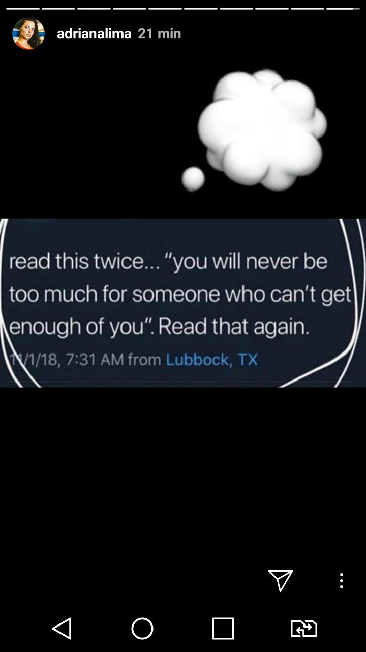 I don't think so, not exactly lol. If anything that seems she is TRYING to be positive and nice. Its probably correlated with how people think she is too good for him or something. I hope she didn't post that because thats how HE feels (that she is too much/good for him). It would not be the first time she did that for him. I mean, while people think its true, him being insecure himself is not good. This isn't the first time she posted a message like that for him. And as I said before, its obvious he is not a secure person, you can see by the little things he does, he isn't. And the fact that she posts quotes about love aimed at someone who is insecure... Smh, thats not good. I hope she knows its not a good sign and its important to have someone who is secure and who doesn't care what others say so much. Thats the reason why she is so censored herself now, she is with somebody who cares too much about what others say. The bad signs are shown to Adriana multiple times and she still brushes them off. In real life being in a relationship with someone who is so insecure about it is "trouble" but Adriana probably doesn't see it as trouble.