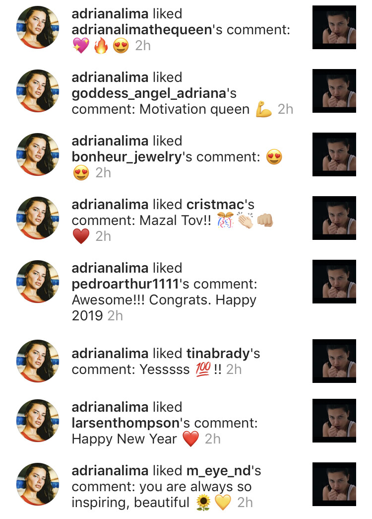 Her team def posted that post because its 2019, and she still hasn't posted shit because she is with the leech monster, its just awkward as a public figure who is still supposed to be moving along with her career to not post anything into the new year. She isn't fully retired so, she still has to act like her social media is there to use. If her team didn't post her puma stuff, she probably still wouldn't have posted anything since last year. You know that dude likes to stay extra long after the holidays and Adriana isn't going to post anything with him around. So, her team has to.However, I am sure those likes to fans are from her. Her team only does the bare MINIMUM on her social media account lol. They are not gonna like any comments or make any comments for her. Plus, along with the fan comments that she posted, there were comments by her friends that she liked as well. Her team wouldn't like those for her. It was her liking the fan comments I am sure