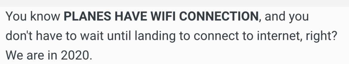 @laeteita Ok because apparently you also need an explanation..... I did NOT call you or anyone an idiot. I was sent the following response I attached. To ME it came off condescending. Like trying to make me look dumb. Maybe that was not their intention however but it didn’t come off in the best tone when reading that. That is what I meant when I said I am not an idiot. I was not calling you or anyone who was unaware that in these days most planes have WiFi an idiot. So sorry if you or @patt interpreted it like that
