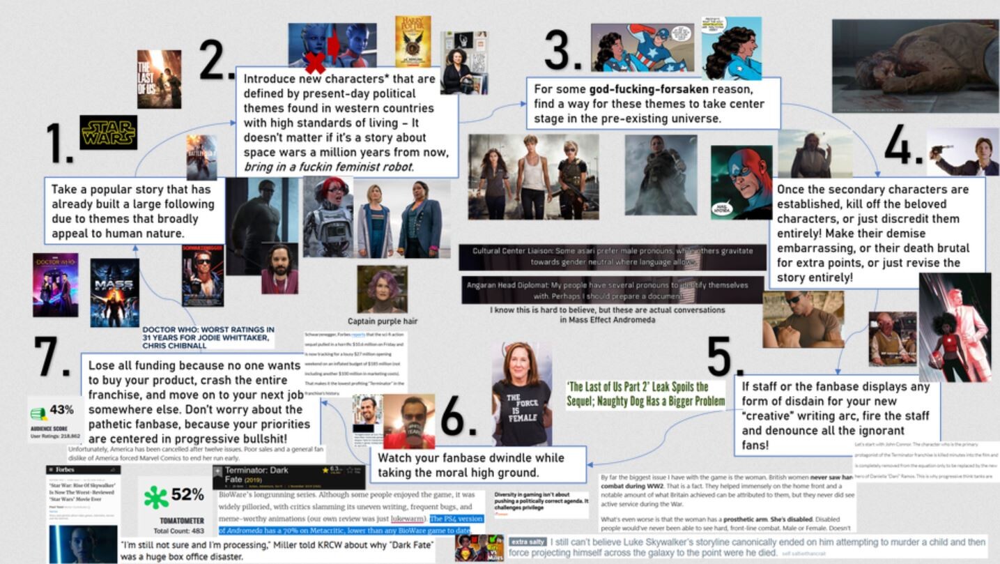 What's meant to be escapes like video games, movies, TV shows, etc have been infested with identity politics that lecture people instead of creating a good story with good characters.