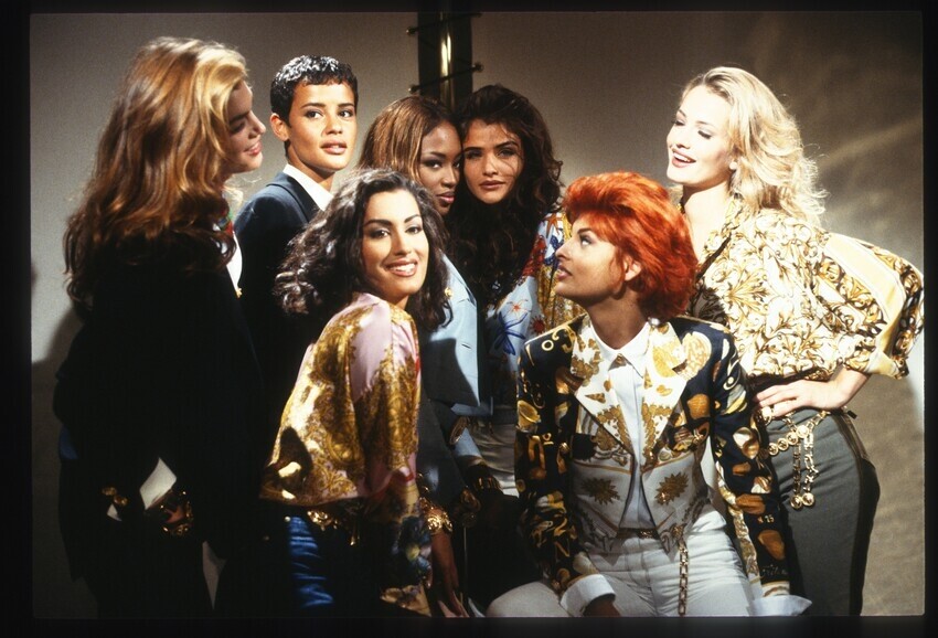 Helena Christensen for Gianni Versace, ready-to-wear, fall/winter 1995, with Valeria Mazza, Naomi Campbell, Karen Mulder, Claudia Schiffer, Shalom Harlow & Nadja Auermann